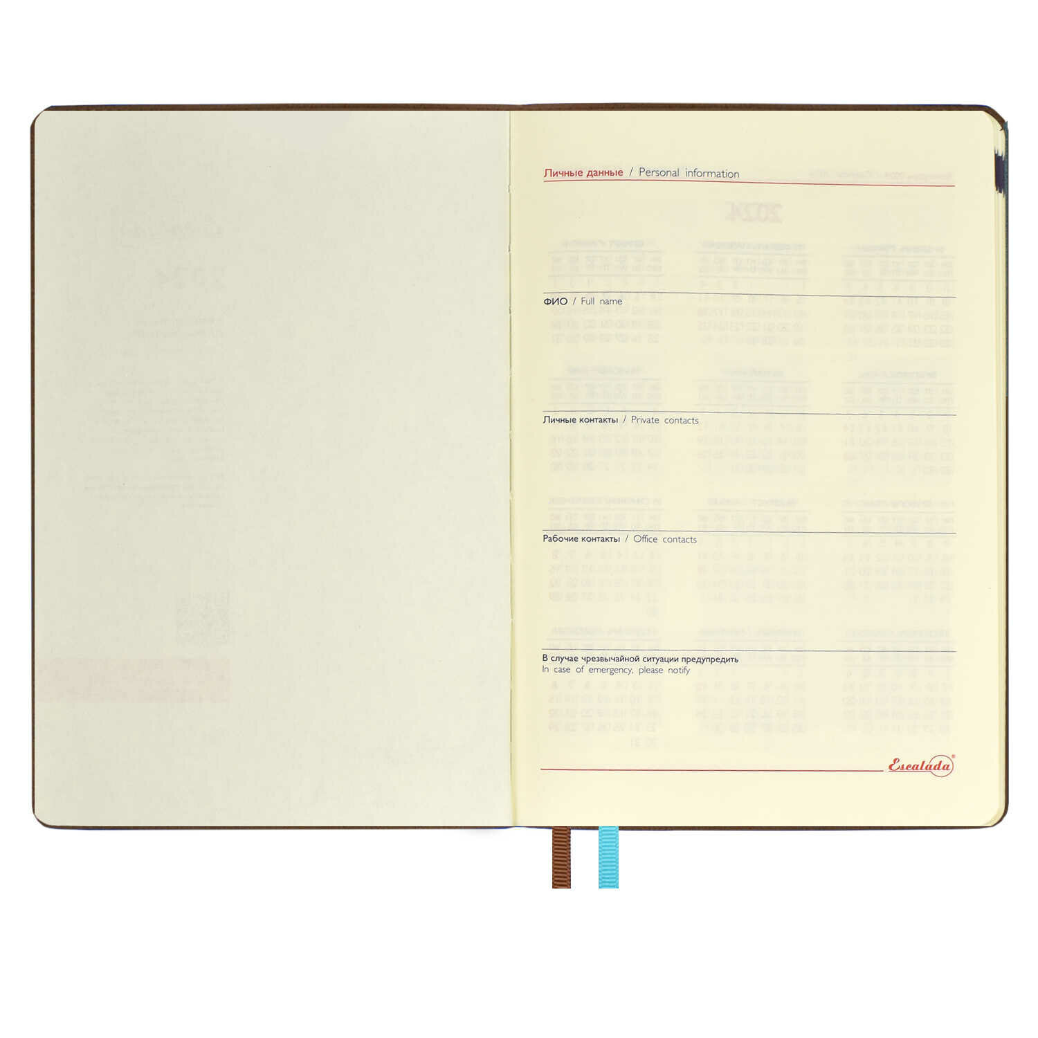 Еженедельник датированный 2024 ESCALADA, формат А5+ (157х225 мм), 80 л. Обложка: мягкий переплёт, запаянный край, тиснение фольгой, есть, скруглённый корешок, закруглённые углы обложки. Внутренний блок: ниткошвейный, тонированный офсет 70 г/м?, печать в две краски (линия), закруглённые углы блока, нет, есть. Красочность форзаца: печать пантоном. Закладка: два ляссе. Каптал: есть. Индивидуальная упаковка: ПЭТ-пакет.