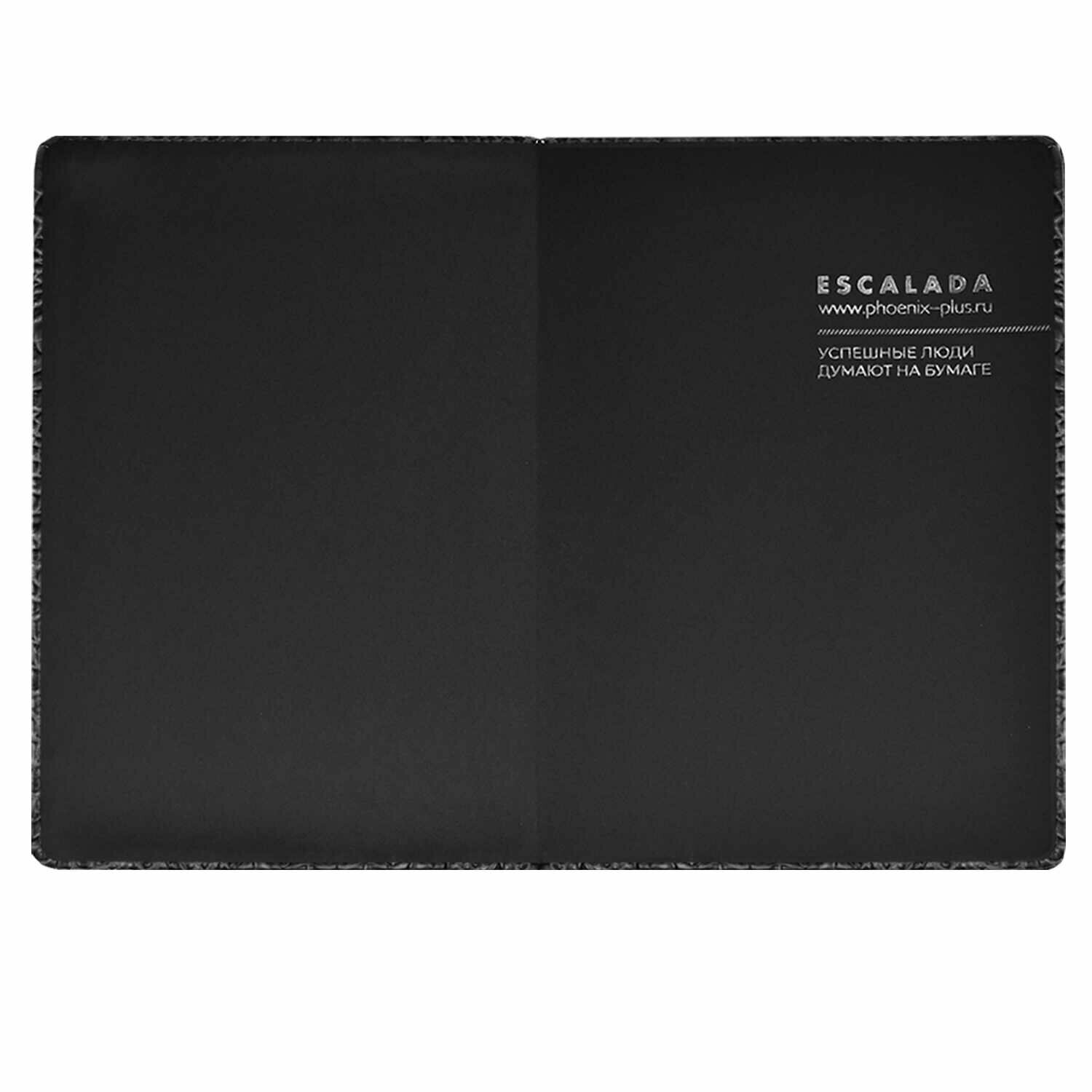 Ежедневник недатированный ESCALADA, формат А5+ (175x245 мм), 160 л. Обложка: твёрдый переплёт с поролоном, есть, скруглённый корешок, закруглённые углы обложки. Внутренний блок: ниткошвейный, кремовый офсет 80 г/м?, печать в две краски (линия), закруглённые углы блока, нет, есть. Красочность форзаца: печать пантоном, печать фольгой. Отделка среза: окрашивание пантоном. Закладка: два ляссе. есть. Индивидуальная упаковка: промостикер + подарочная картонная коробка с ПВХ-крышкой + ПЭТ-пакет.