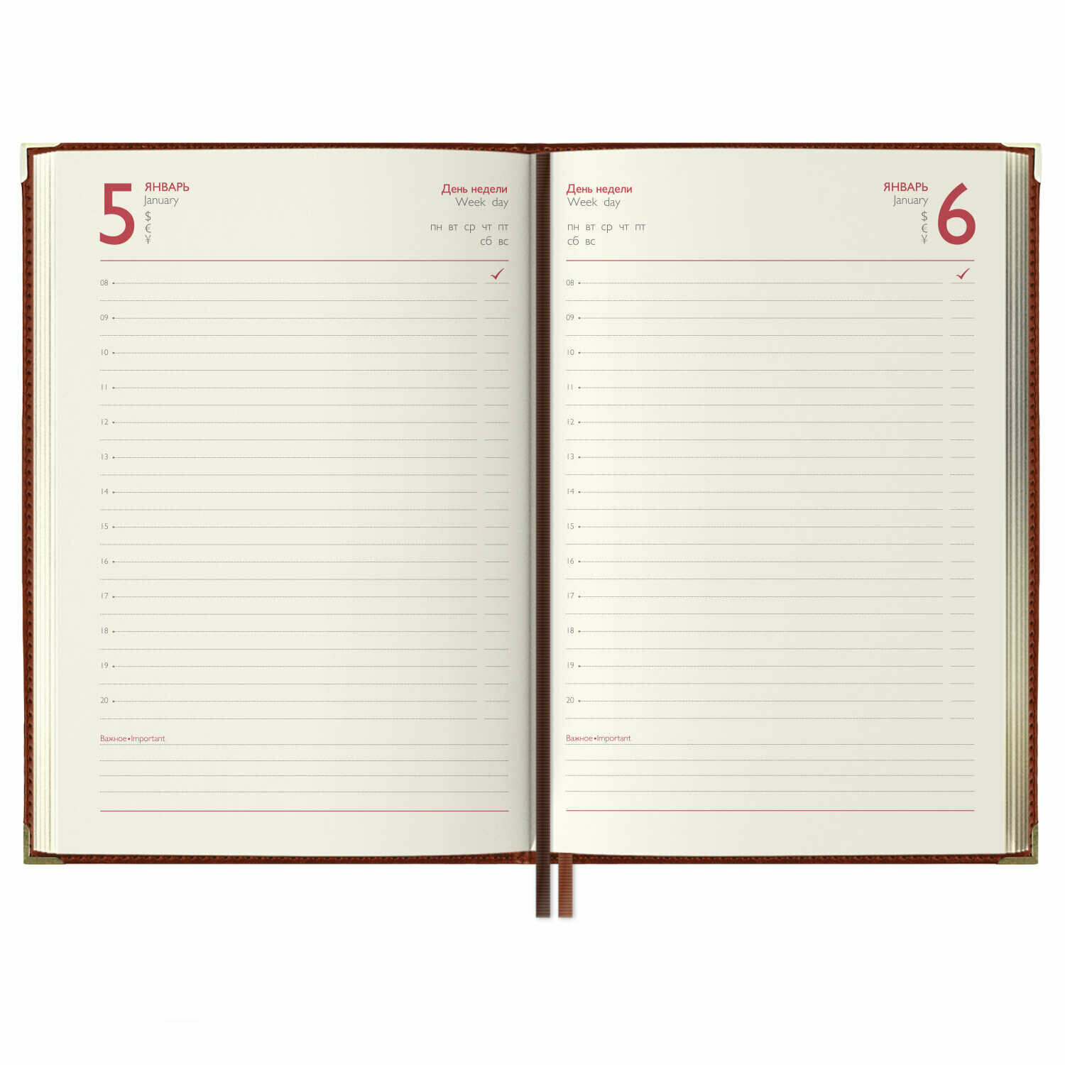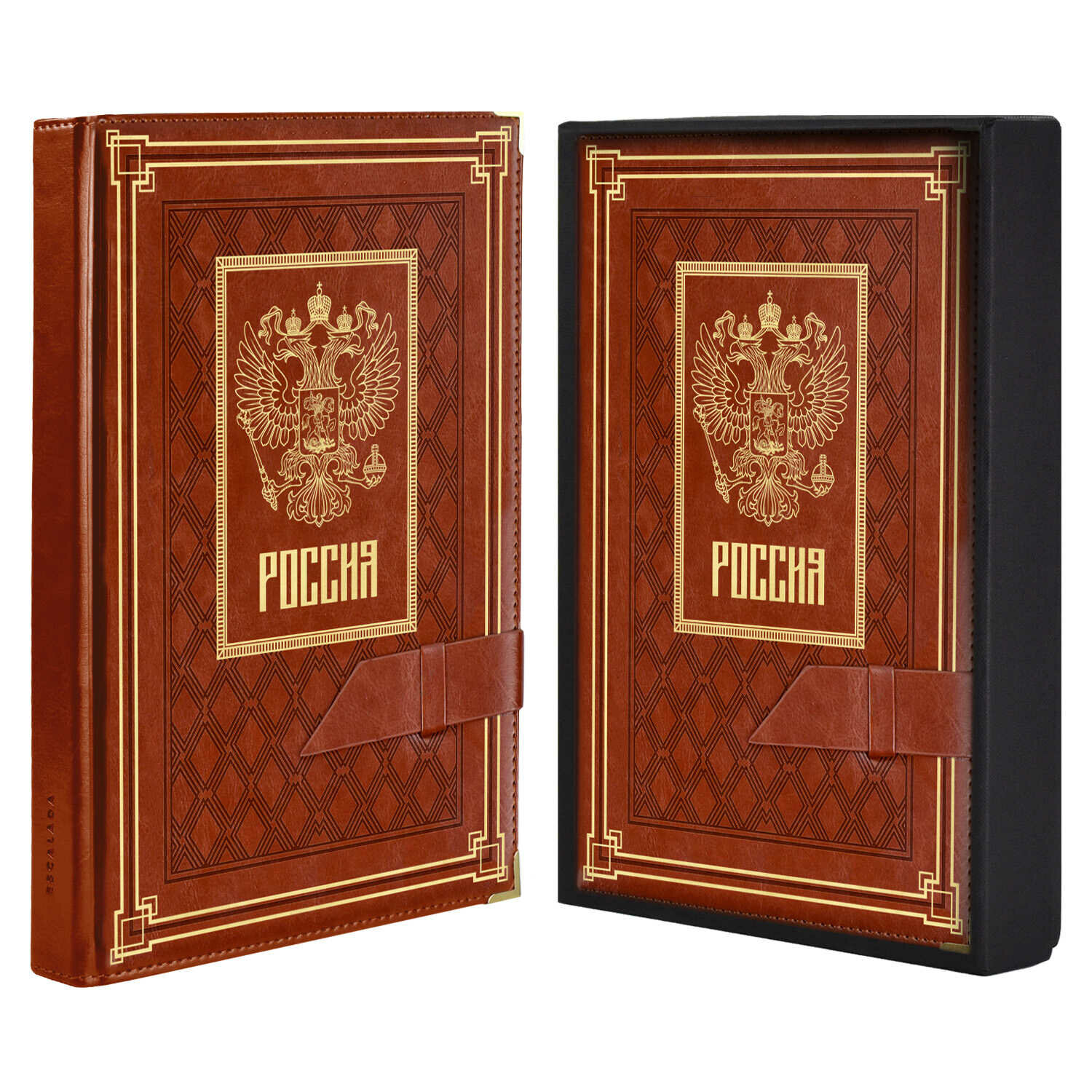 Ежедневник полудатированный , формат А5+ (175x245 мм), 192 л. Обложка: твёрдый переплёт с поролоном, блинтовое тиснение, металлические уголки, тиснение фольгой, есть, прямой корешок, прямые углы обложки. Внутренний блок: ниткошвейный, кремовый офсет 80 г/м?, печать в две краски (линия), прямые углы блока, нет, есть. Красочность форзаца: печать пантоном. Отделка среза: фольгирование. Закладка: два ляссе. есть. Особенности: застёжка "хляст в петле". Индивидуальная упаковка: подарочная картонная коробка с ПВХ-крышкой + ПЭТ-пакет.