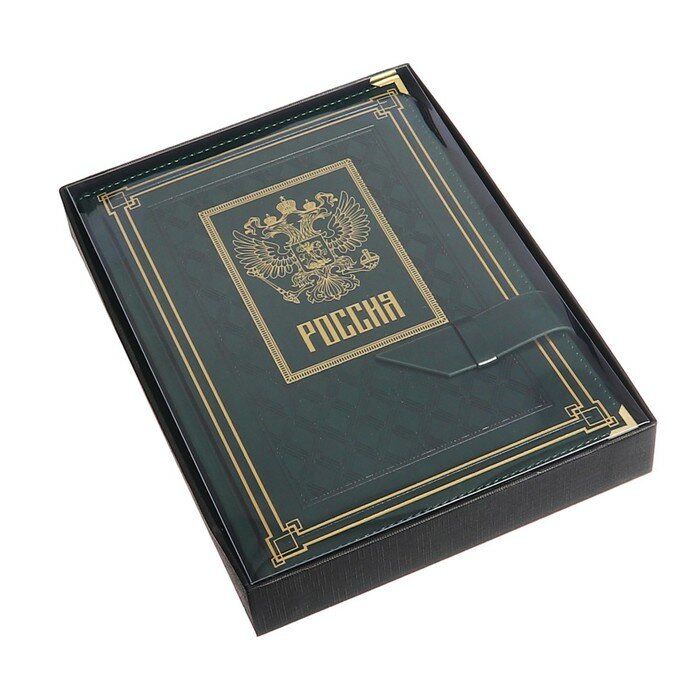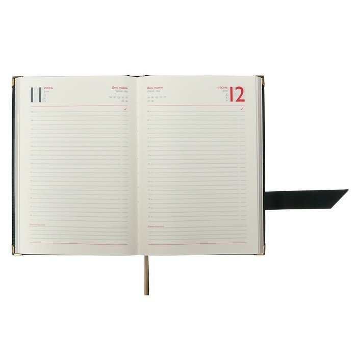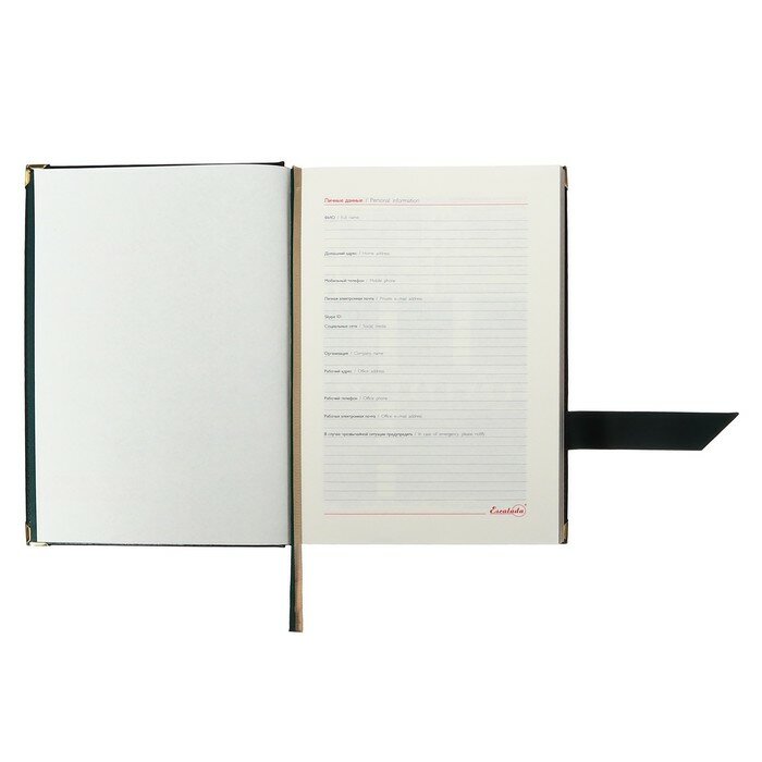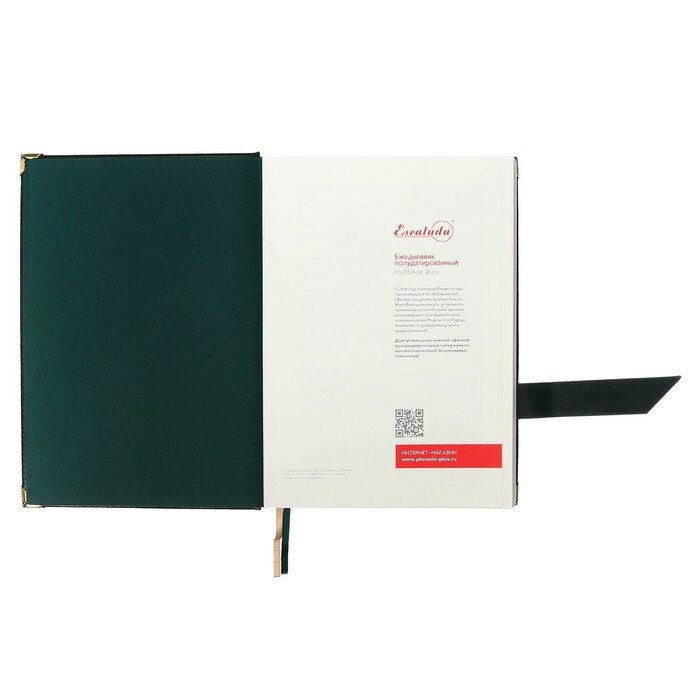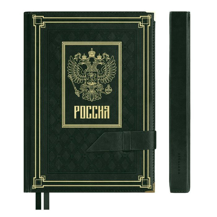 Ежедневник полудатированный ESCALADA, формат А5+ (175x245 мм), 192 л. Обложка: твёрдый переплёт с поролоном, блинтовое тиснение, металлические уголки, тиснение фольгой, есть, прямой корешок, прямые углы обложки. Внутренний блок: ниткошвейный, кремовый офсет 80 г/м?, печать в две краски (линия), прямые углы блока, нет, есть. Красочность форзаца: печать пантоном. Отделка среза: фольгирование. Закладка: два ляссе. есть. Особенности: застёжка "хляст в петле". Индивидуальная упаковка: подарочная картонная коробка с ПВХ-крышкой + ПЭТ-пакет.