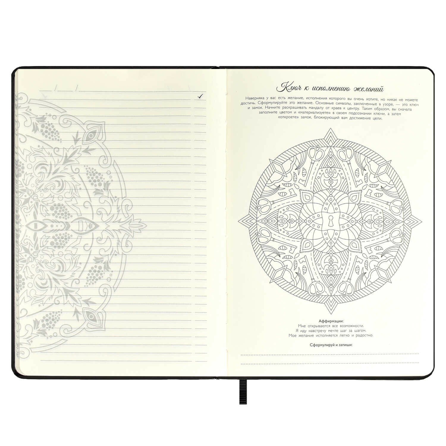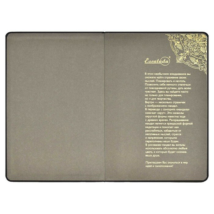 Ежедневник недатированный ESCALADA, формат А5 (146х211 мм), 124 л. Обложка: твёрдый переплёт, тиснение фольгой конгревное, нет, скруглённый корешок, закруглённые углы обложки. Внутренний блок: ниткошвейный, белый офсет 120 г/м?, 70 г/м?, печать в одну краску (линия), закруглённые углы блока, нет, есть. Красочность форзаца: печать пантоном, печать фольгой. Закладка: одно ляссе. есть. Особенности: 4 листа антистресс-раскрасок "Мандалы" с инструкциями по раскрашиванию. Индивидуальная упаковка: подарочная картонная коробка с ПВХ-крышкой + промостикер + ПЭТ-пакет.