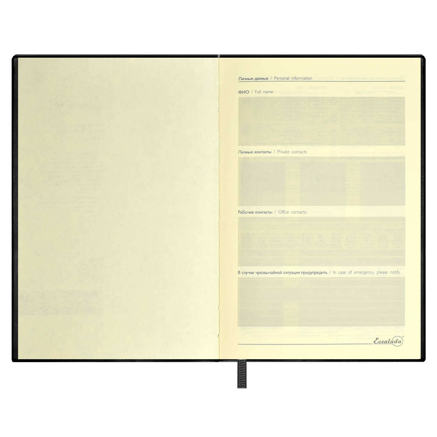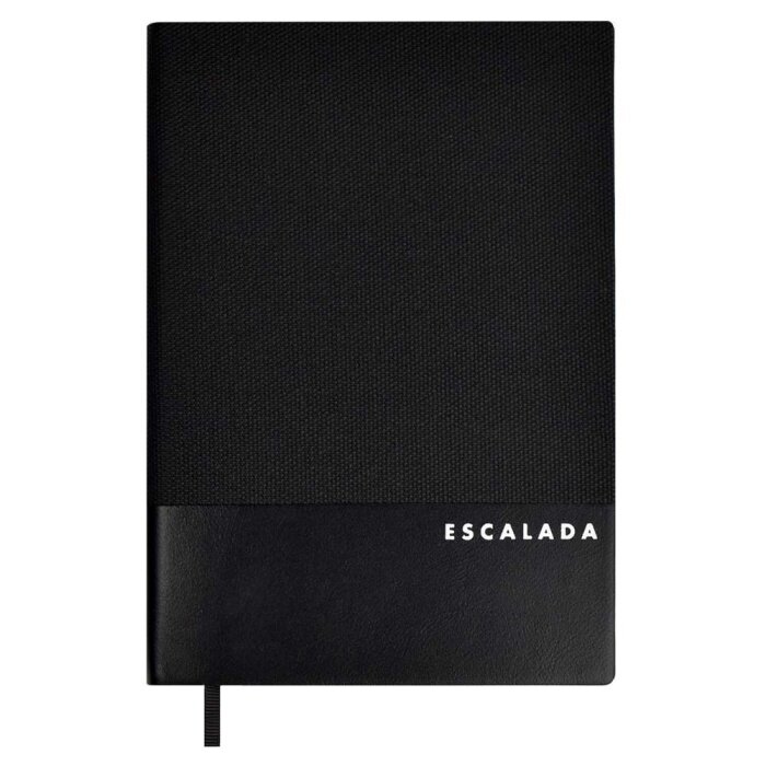 Ежедневник недатированный ESCALADA, формат А5 (146х211 мм), 160 л. Обложка: мягкий переплёт, запаянный край, тиснение фольгой, нет, скруглённый корешок, прямые углы обложки. Внутренний блок: ниткошвейный, кремовый офсет 70 г/м?, печать в одну краску (линия), прямые углы блока, нет, есть. Красочность форзаца: печать пантоном. Отделка среза: окрашивание пантоном. Закладка: одно ляссе. есть. Особенности: комбинированные материалы. Индивидуальная упаковка: ПЭТ-пакет.