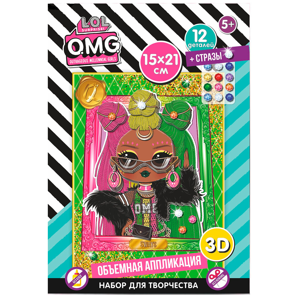 Яркие незабываемые куклы L.O.L. SURPRISE! OMG! представлены теперь в технике объемной аппликации. Вырубленные детали не требуют использования ножниц, для соединения слоев в наборе предусмотрен двусторонний скотч. Разноцветные переливающиеся стразы набора придадут дополнительный блеск творческому результату. Прекрасный подарок для блестящего результата!