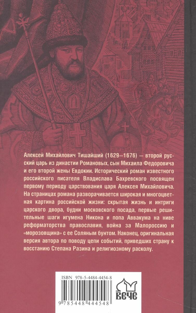 Алексей Михайлович Тишайший (1629—1676) — второй русский царь из династии Романовых, сын Михаила Федоровича и его второй жены Евдокии. Исторический роман известного российского писателя Владислава Бахревского посвящен первому периоду царствования царя Алексея Михайловича. На страницах романа разворачивается широкая и многоцветная картина российской жизни: скрытая жизнь и интриги царского двора, будни московского посада, первые решительные шаги игумена Никона и попа Аввакума на ниве реформаторства православия, война за Малороссию и «морозовщина» с ее Соляным бунтом. Наконец, оригинальная версия автора по поводу цепи событий, приведших страну к восстанию Степана Разина и религиозному расколу.