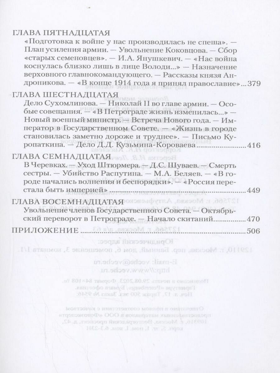 Книга является второй частью воспоминаний профессора Николаевской академии Генерального штаба, военного министра Российской империи в 1905—1909 гг. А.Ф. Редигера. В ней рассказывается о завершении его служебной деятельности в качестве военного министра, об участии в работе Государственного совета, событиях Февральской и Октябрьской революций 1917 года, и заканчивается она описанием начала скитаний на фоне разгорающейся Гражданской войны.