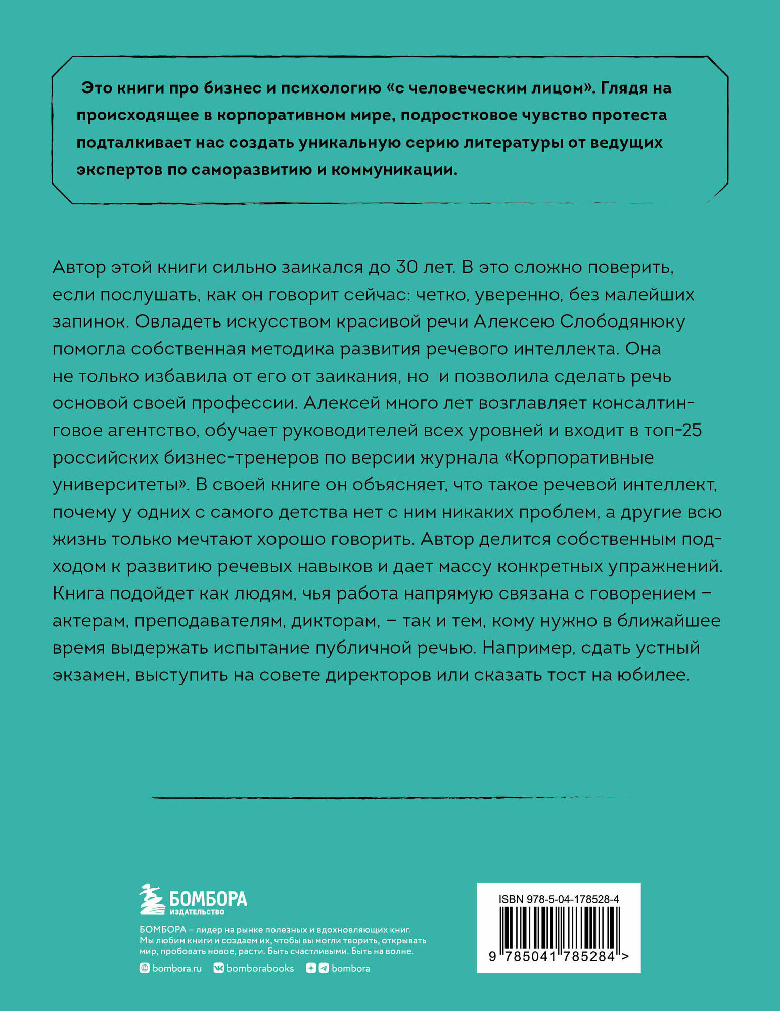 Автор этой книги сильно заикался до 30 лет. В это сложно поверить, если послушать, как он говорит сейчас: четко, уверенно, без малейших запинок. Овладеть искусством красивой речи Алексею Слободянюку помогла собственная методика развития речевого интеллекта. Она не только избавила от его от заикания, но и позволила сделать речь – основой своей профессии. Алексей много лет возглавляет консалтинговое агентство, обучает руководителей всех уровней и входит в топ-25 российских бизнес-тренеров, по версии журнала ""Корпоративные университеты"". В своей книге он объясняет, что такое речевой интеллект, почему у одних с самого детства нет с ним никаких проблем, а другие всю жизнь только мечтают хорошо говорить. Автор делится собственным подходом к развитию речевых навыков и дает массу конкретных упражнений. Книга подойдет как людям, чья работа напрямую связана с говорением – актерам, преподавателям, дикторам, – так и тем, кому нужно ближайшее время выдержать испытание публичной речью. Например, сдать устный экзамен, выступить на совете директоров или сказать тост на юбилее.