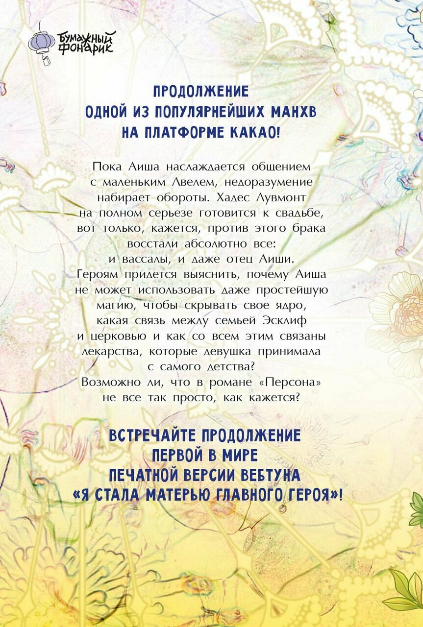 Продолжение одной из популярнейших манхв на платформе Kakao!Пока Аиша наслаждается общением с маленьким Авелем, недоразумение набирает обороты. Хадес Лувмонт на полном серьезе готовится к свадьбе, вот только, кажется, что против этого брака восстали абсолютно все: и вассалы, и даже отец Аиши. Героям придется выяснить, почему Аиша не может использовать даже простейшую магию, чтобы скрывать свое ядро, какая связь между семьей Эсклиф и церковью и как со всем этим связаны лекарства, которые девушка принимала с самого детства?Возможно ли, что в романе «Персона» не все так просто, как кажется?Встречайте продолжение первой в мире печатной версии вебтуна «Я стала матерью главного героя»!