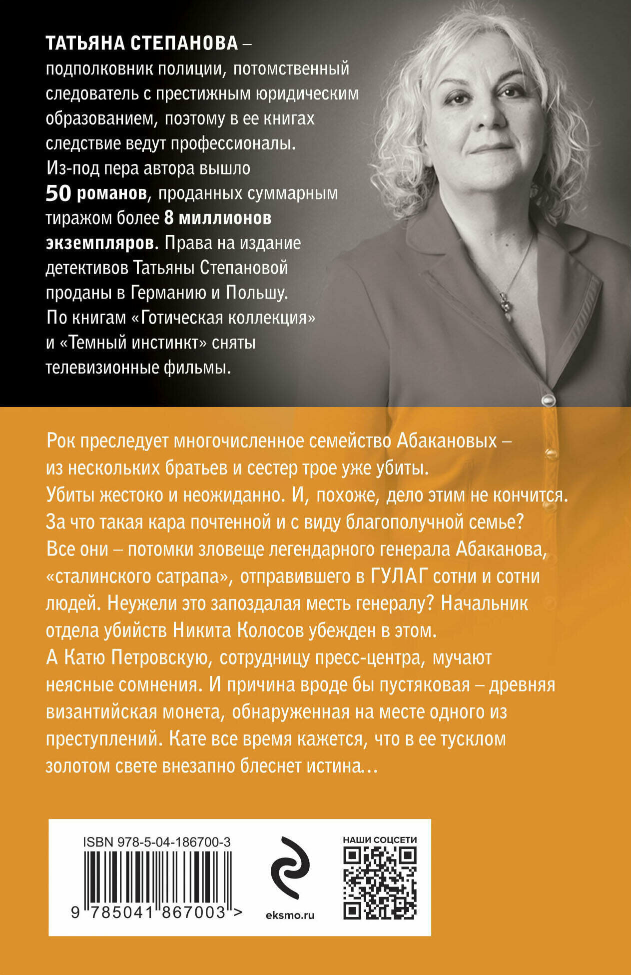 Рок преследует многочисленное семейство Абакановых — из нескольких братьев и сестер трое уже убиты. Убиты жестоко и неожиданно. И, похоже, дело этим не кончится. За что такая кара почтенной и с виду благополучной семье? Все они — потомки зловеще-легендарного генерала Абаканова, «сталинского сатрапа», отправившего в ГУЛАГ сотни и сотни людей. Неужели это запоздалая месть генералу? Начальник отдела убийств Никита Колосов убежден в этом. А Катю Петровскую, сотрудницу Пресс-центра, мучают неясные сомнения. И причина вроде бы пустяковая — древняя византийская монета, обнаруженная на месте одного из преступлений. Кате все время кажется, что в ее тусклом золотом свете внезапно блеснет истина…
