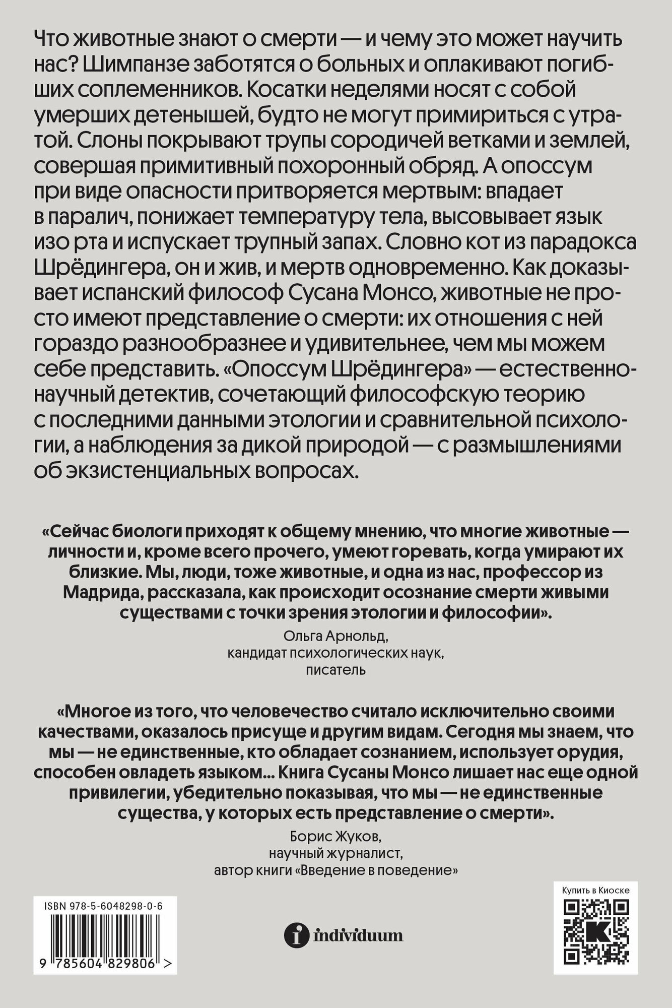 Как доказывает испанский философ Сусана Монсо, животные не просто имеют представление о смерти: их отношения с ней гораздо разнообразнее и удивительнее, чем мы можем себе представить. «Опоссум Шрёдингера» — естественно-научный детектив, сочетающий философскую теорию с последними данными этологии и сравнительной психологии, а наблюдения за дикой природой — с размышлениями об экзистенциальных вопросах.