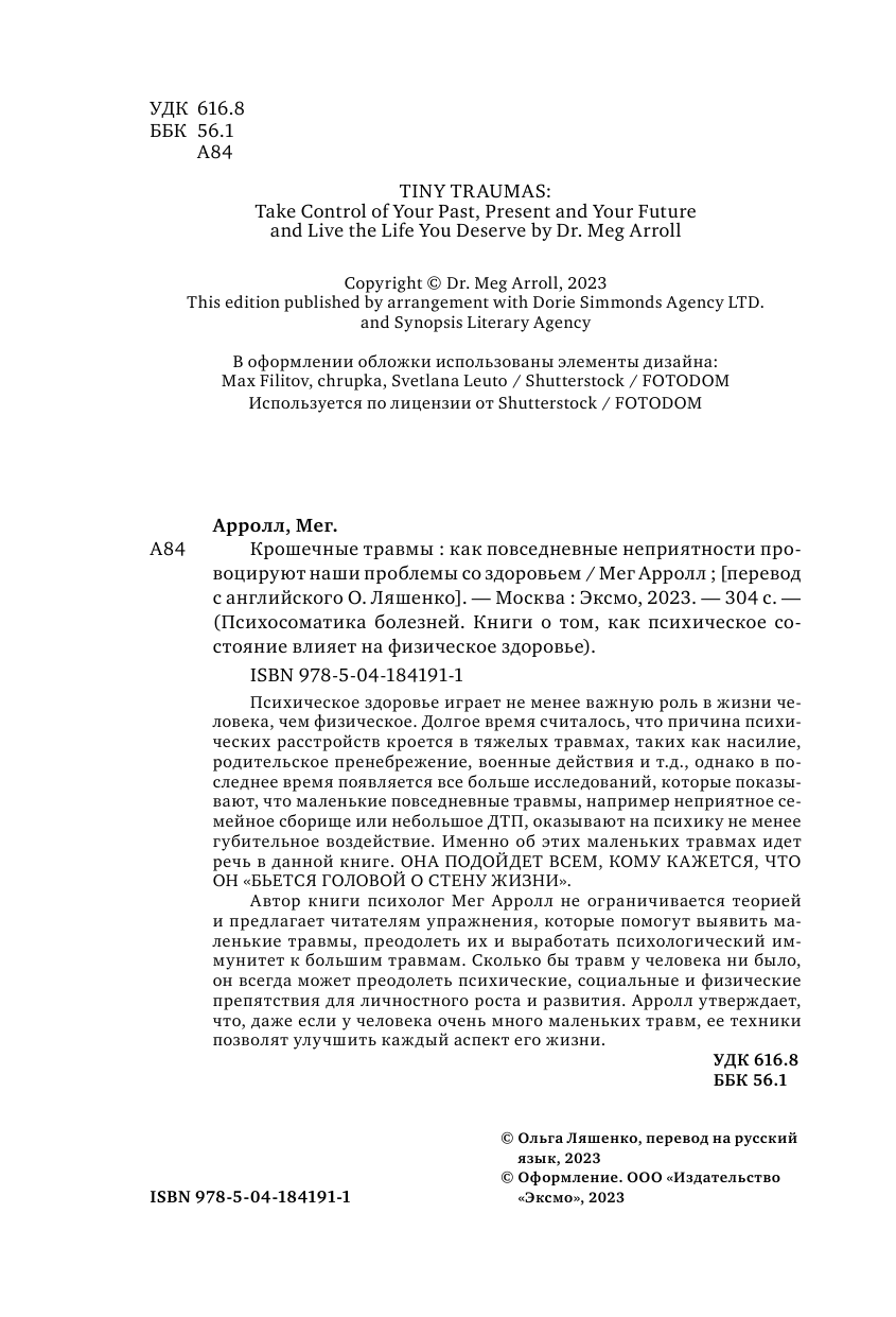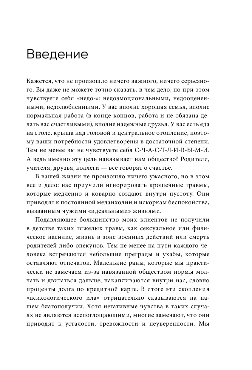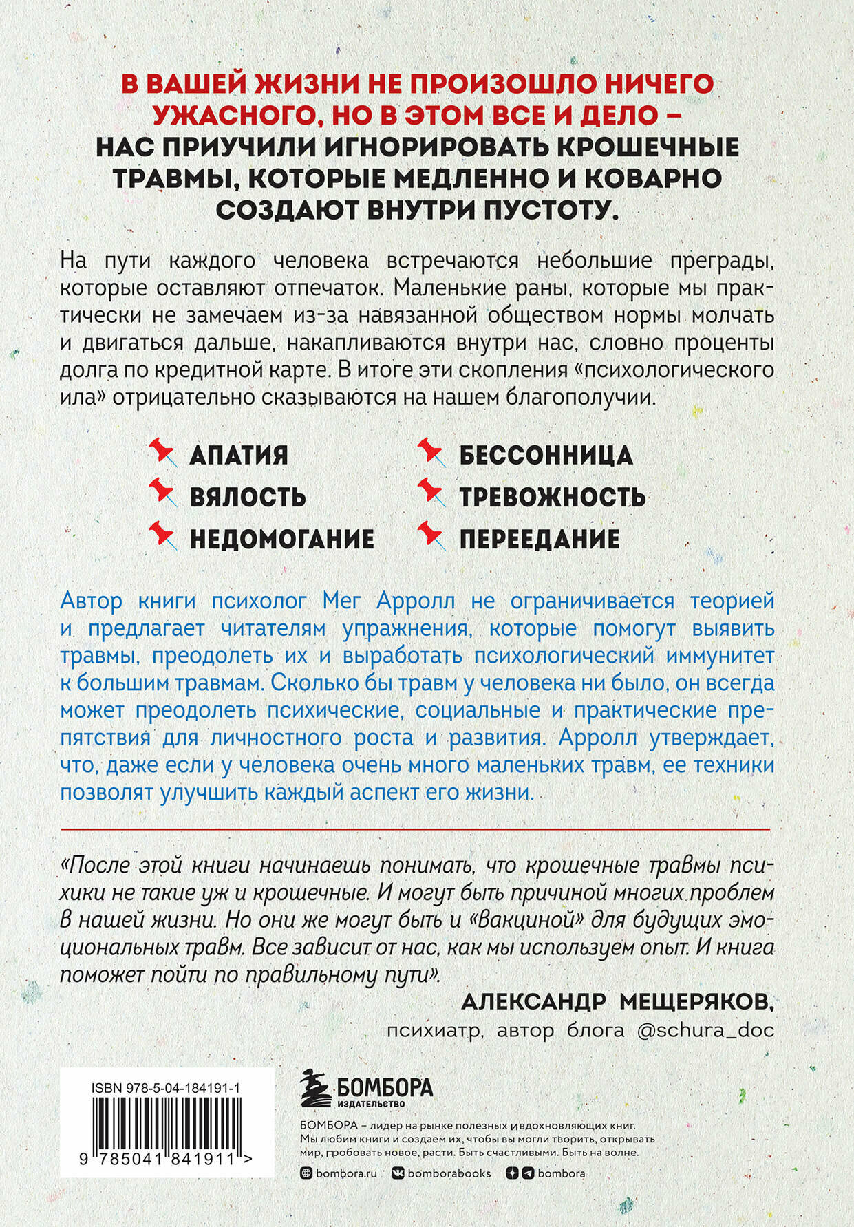 «После этой книги начинаешь понимать, что крошечные травмы психики не такие уж и крошечные. И могут быть причиной многих проблем в нашей жизни. Но они же могут быть и "вакциной" для будущих эмоциональных травм. Все зависит от нас, как мы используем опыт. И книга поможет пойти по правильному пути». — АЛЕКСАНДР МЕЩЕРЯКОВ, психиатр, автор блога @schura_doc