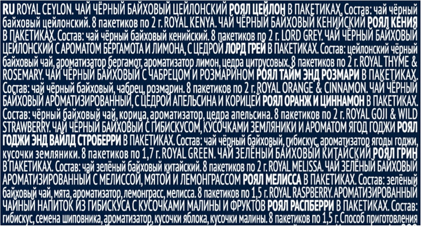 КОРОЛЕВСКАЯ КОЛЛЕКЦИЯ ПРЕВОСХОДНОГО ЧАЯ! Запоминающийся подарок для тех, кто предпочитает лучшее. Элегантная отделка с золотыми вензелями навевает мысли о шкатулке с драгоценностями. Внутри подлиное сокровище - коллекция превосходного чая RICHARD. Ассорти из девяти сортов чёрного, зелёного и фруктового чая королевского качества - по восемь сашетов каждого вида.