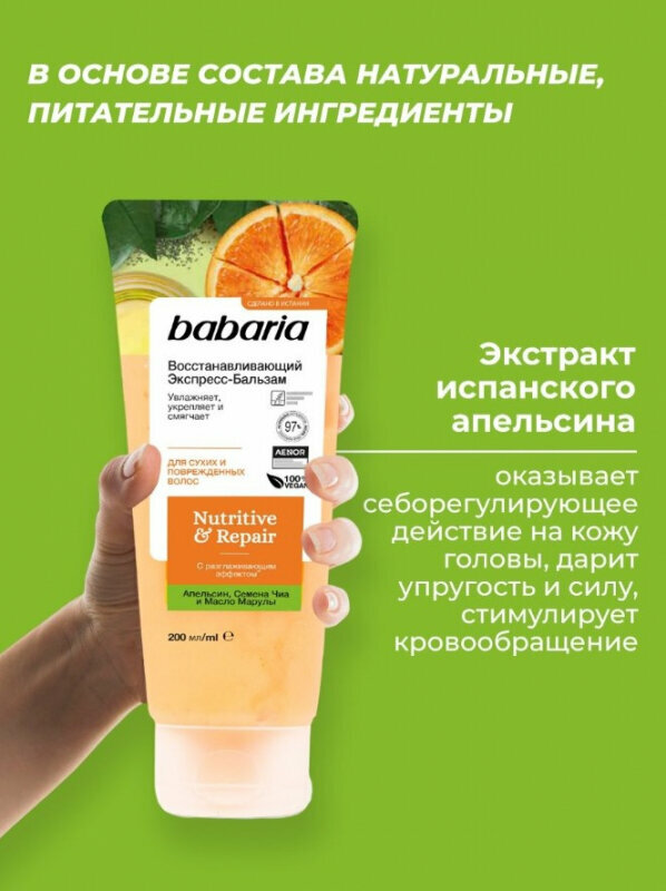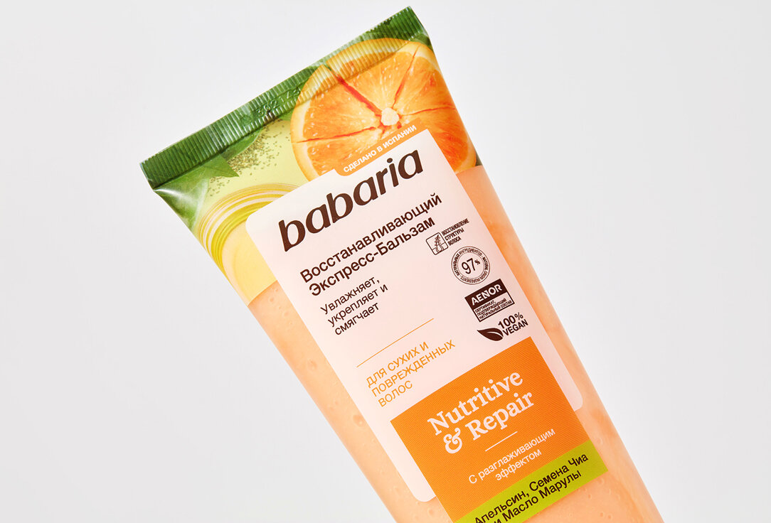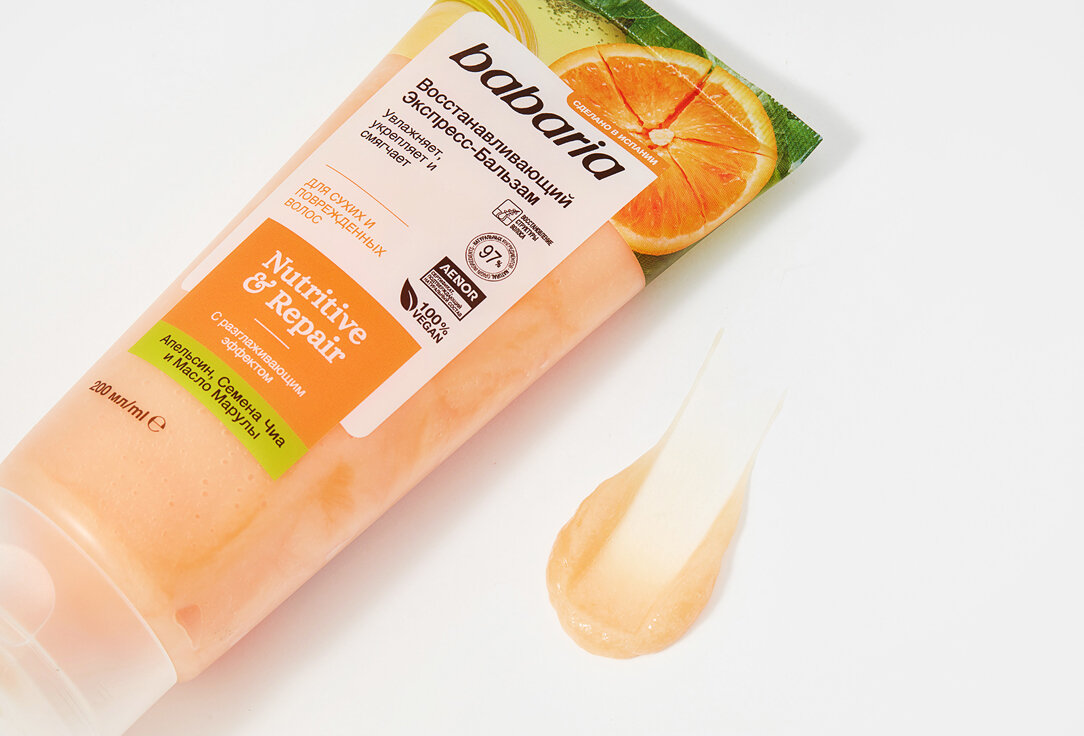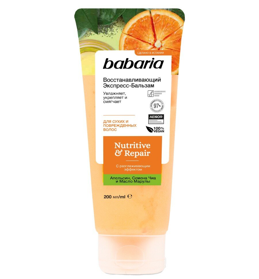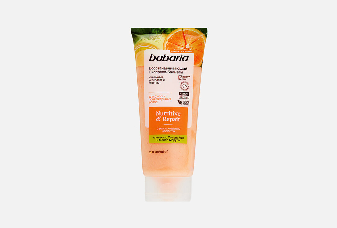 Восстанавливающий экспресс бальзам для волос Babaria с разглаживающим эффектом. В основе состава натуральные, питательные ингредиенты. Семена чиа интенсивно питают полезными веществами. После применения бальзама волосы становятся эластичными, гладкими, обретают здоровый внешний вид. Экстракт испанского апельсина дарит локонам силу, упругость, стимулирует кровообращение и оказывает себорегулирующее действие на кожу головы. Идеально для сухих и поврежденных волос. Рекомендуется использовать вместе с восстанавливающим шампунем и маской от Babaria. Средство смягчает волосы, облегчает укладку и расчесывание. Масло марулы восстанавливает поврежденную структуру прядей, защищает их от воздействий окружающей среды, увлажняет.