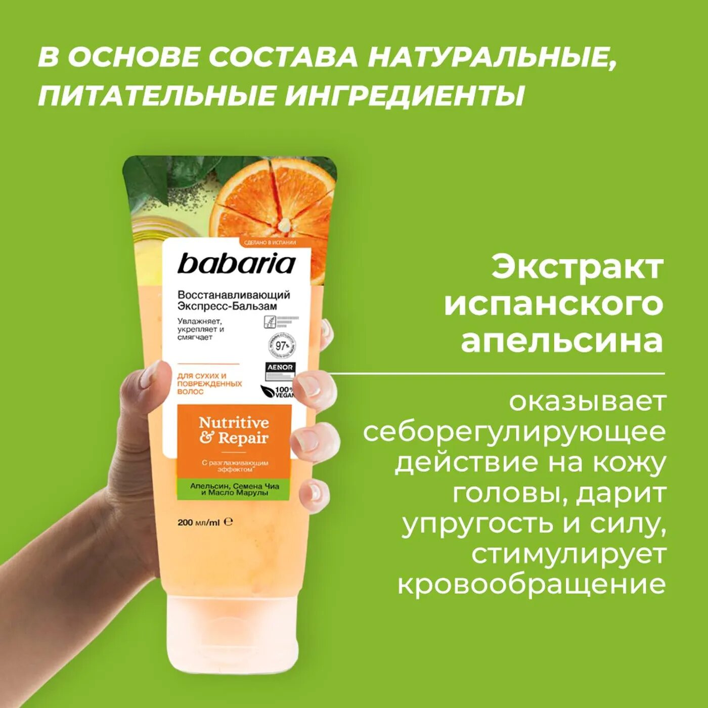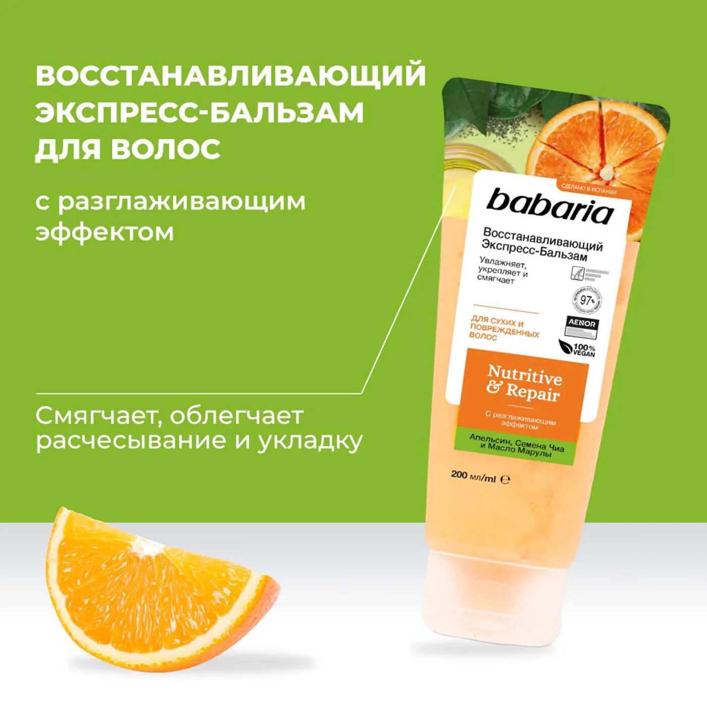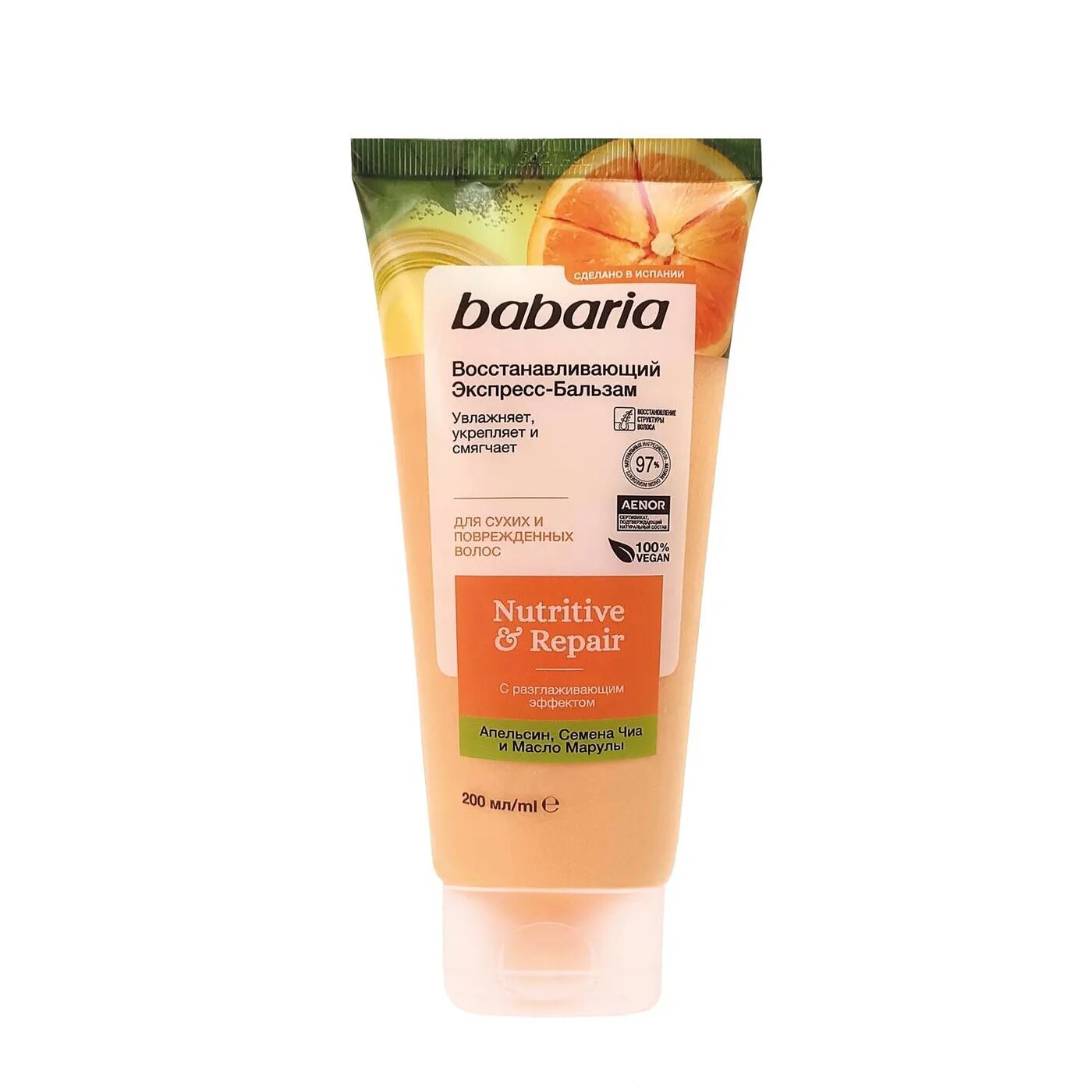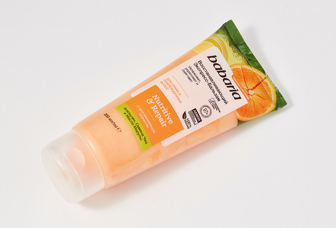 Восстанавливающий экспресс бальзам для волос Babaria с разглаживающим эффектом. В основе состава натуральные, питательные ингредиенты. Семена чиа интенсивно питают полезными веществами. После применения бальзама волосы становятся эластичными, гладкими, обретают здоровый внешний вид. Экстракт испанского апельсина дарит локонам силу, упругость, стимулирует кровообращение и оказывает себорегулирующее действие на кожу головы. Идеально для сухих и поврежденных волос. Рекомендуется использовать вместе с восстанавливающим шампунем и маской от Babaria. Средство смягчает волосы, облегчает укладку и расчесывание. Масло марулы восстанавливает поврежденную структуру прядей, защищает их от воздействий окружающей среды, увлажняет.