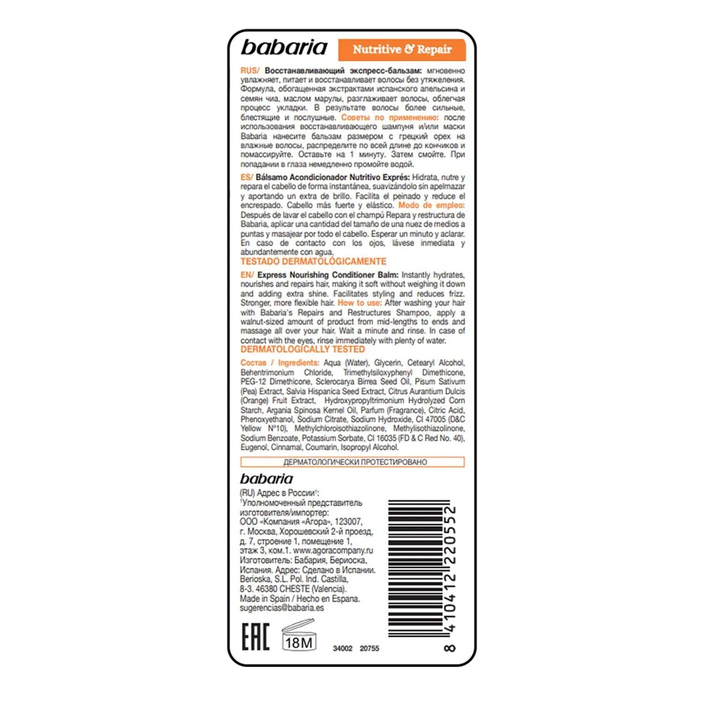 | Химический состав | Aqua (Water), Glycerin, Cetearyl Alcohol, Behentrimonium Chloride, Trimethylsiloxyphenyl Dimethicone, PEG-12 Dimethicone, Sclerocarya Birrea Seed Oil, Pisum Sativum (Pea) Extract, Salvia Hispanica Seed Extract, Citrus Aurantium Dulcis (Orange) Fruit Extract, Hydroxypropyltrimonium Hydrolyzed Corn Starch, Argania Spinosa Kernel Oil, Parfum (Fragrance), Citric Acid, Phenoxyethanol, Sodium Citrate, Sodium Hydroxide, CI 47005 (D&C Yellow Nº10), Methylchloroisothiazolinone, Methylisothiazolinone, Sodium Benzoate, Potassium Sorbate, CI 16035 (FD & C Red No. 40), Eugenol, Cinnamal, Coumarin, Isopropyl Alcohol. |