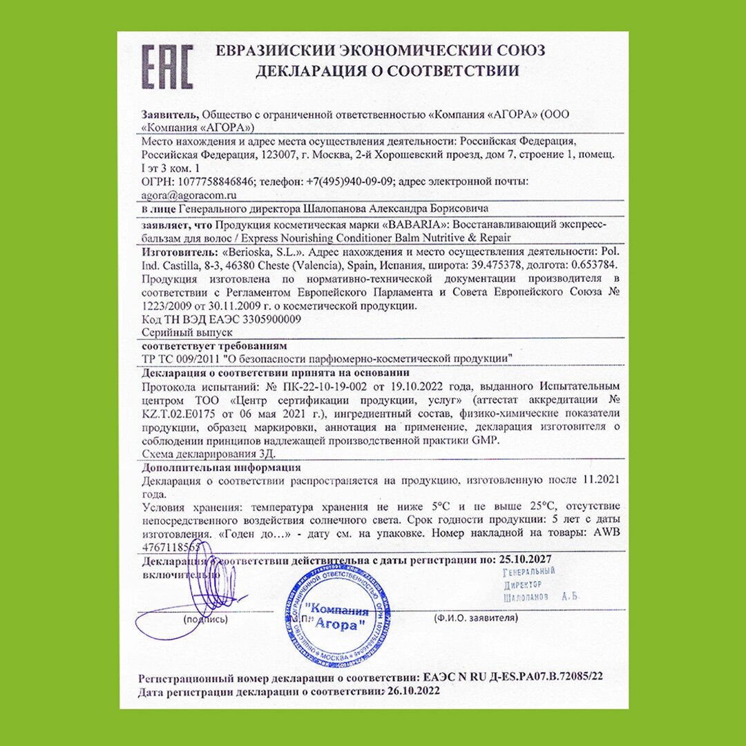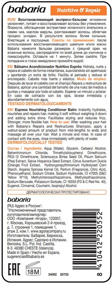 Экспресс-бальзам для волос Babaria восстанавливающий 200мл