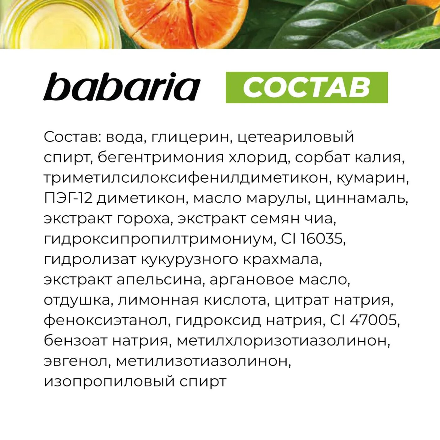| Состав | Water, Glycerin, Cetearyl Alcohol, Behentrimonium Chloride, Trimethylsiloxyphenyl Dimethicone, PEG-12 Dimethicone, Sclerocarya Birrea Seed Oil, Pea Extract, Salvia Hispanica Seed Extract, Orange Fruit Extract, Hydroxypropyltrimonium Hydrolyzed Corn Starch, Argania Spinosa Kernel Oil, Parfum, Citric Acid, Phenoxyethanol, Sodium Citrate, Sodium Hydroxide, CI 47005 (D&C Yellow N 10), Methylchloroisothiazolinone, Methylisothiazolinone, Sodium Benzoate, Potassium Sorbate, CI 16035 (FD&C Red No 40), Eugenol, Cinnamal, Coumarin, Isopropyl Alcohol |