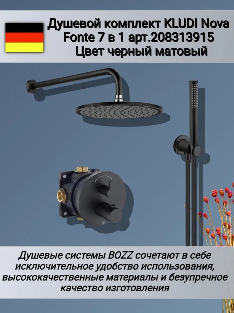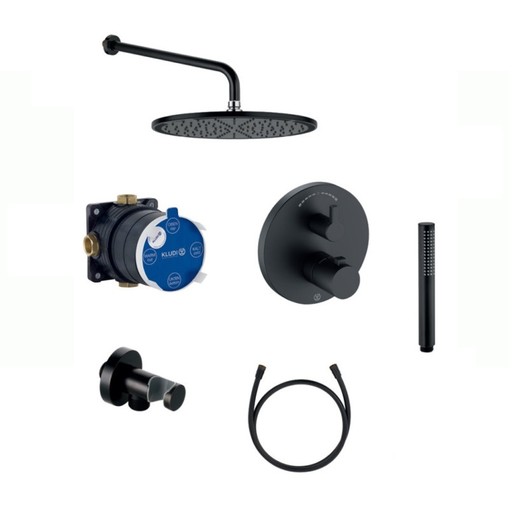 Душевой комплект, Kludi, Nova Fonte Black, 7 в 1, в составе-смеситель для душа термостатический арт. 208303915, внутренняя часть FLEXX.BOXX арт. 88011, верхний душ 300*300 мм арт. 6433087-00, держатель верхнего душа арт. 6651439-00, ручной душ 1S арт. 3912039-00, шланг для душа SUPARAFLEX 1600 мм арт. 6107139-00, шланговое подсоединение с держателем арт. 6054739-00, цвет-черный матовый Встраиваемая система Внутренняя монтажная часть в комплекте С термостатическим смесителем Рычажное управление Латунь / отдельные элементы изготовлены из пластика Длина шланга: 125 см Пластиковый шланг Размер верхнего душа: 30 см Форма верхнего душа: круглая Количество режимов струи верхнего душа: 1 (бодрящая) Размер лейки(ВхГхШ): 20х2,5х2,5 см Количество режимов струи лейки: 1 (бодрящая) Термостатический картридж Стандарт подводки: 1/2" Минимальное рабочее давление: 1 бар Максимальное рабочее давление: 10 бар Защита от обратного потока обеспечивается встроенным клапаном, препятствующим стоку воды обратно в трубопровод Гарантия: 5 лет Германия