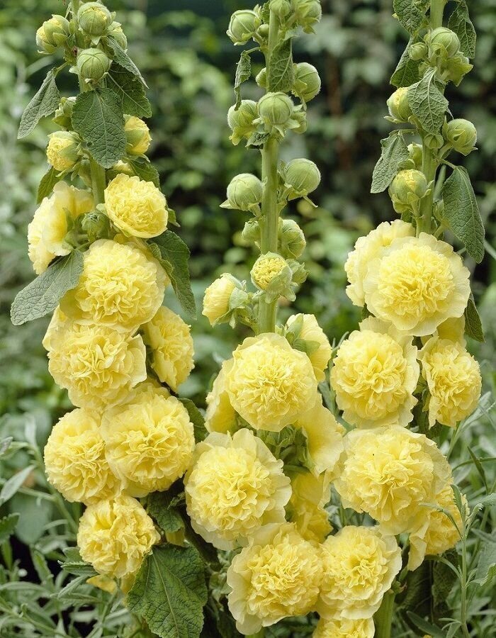 Многолетнее растение из семейства Мальвовых, культивируемое как двулетник, высотой до 2-2,5 м. Цветет с конца июня по сентябрь. Цветки махровые, золотисто-желтой окраски, 8-12 см в диаметре, собраны в крупное эффектное соцветие-кисть. Светолюбива и засухоустойчива, к почвам нетребовательна, но предпочитает участки с хорошо обработанной плодородной почвой. На зиму желательно укрывать. Выращивают прямым посевом в открытый грунт в мае. Используется для посадки в группах, миксбордерах, для декорирования стен зданий и изгородей, а также для получения срезки.