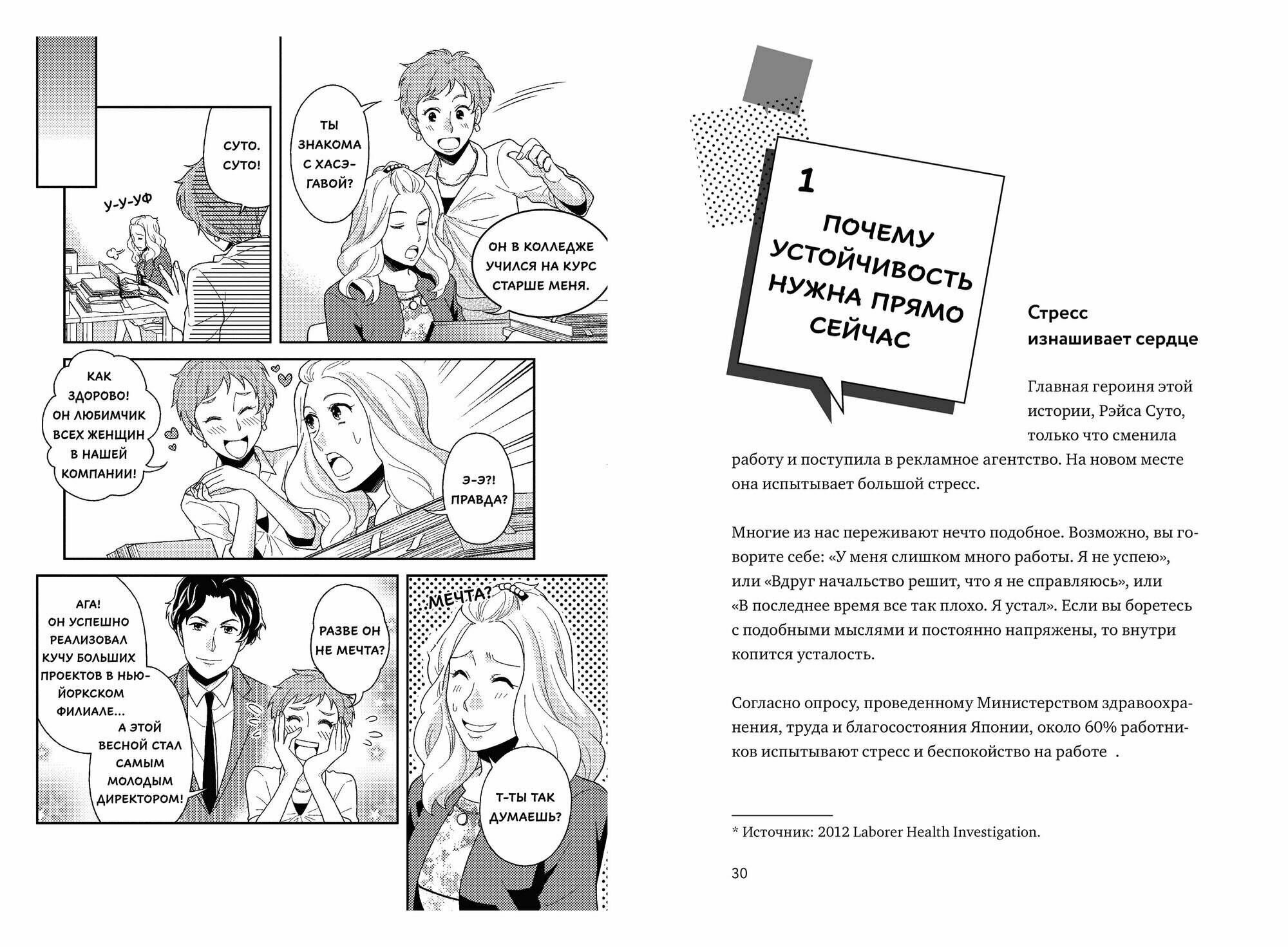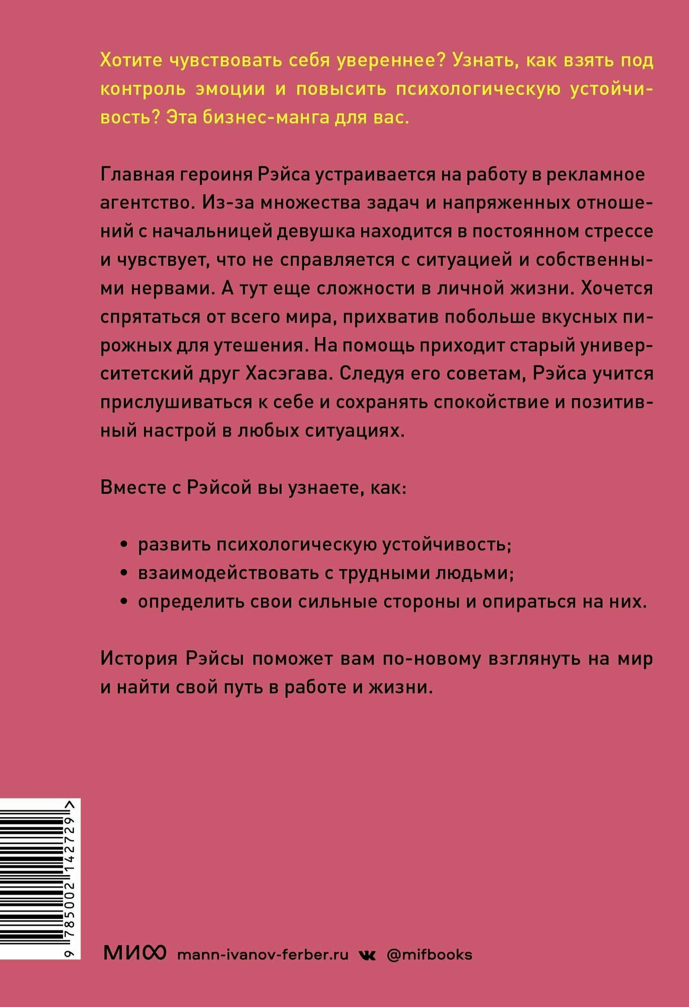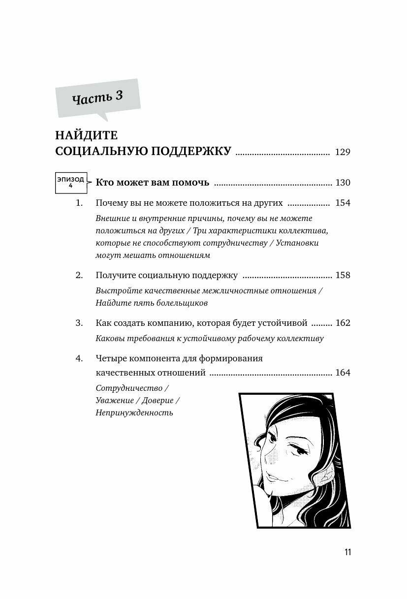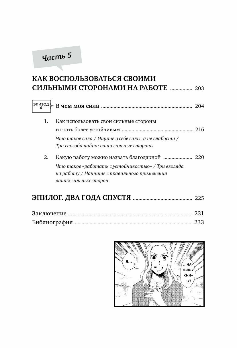 Первая в России серия бизнес-манги, где просто и доступно объясняются базовые концепции бизнеса и психологии. Вместе с главной героиней Рэйсой вы научитесь прислушиваться к себе и сохранять спокойствие и позитивный настрой в любых обстоятельствах. Молодая девушка Рэйса работает в рекламном агентстве. Из-за множества задач, с которыми она должна справляться, и резких комментариев своего босса девушка находится в постоянном стрессе и не знает, как справиться со сложившейся ситуацией. В компанию приходит новый директор Хасэгава, с которым Рэйса вместе училась в университете. Из взбалмошного и безалаберного студента Хасэгава превратился в целеустремленного, спокойного и уверенного в себе профессионала. Рэйса обращается к нему за советом, и Хасэгава помогает девушке. Следуя его советам, Рэйса учится сохранять спокойствие и позитивный настрой даже в сложных ситуациях, берет под контроль свои эмоции, становится более уверенной в себе. Вместе с Рэйсой вы узнаете: как легко и эффективно применять в своей жизни принципы позитивной психологии и устойчивости; как остерегаться эмоциональных вампиров, расширять свои возможности и контролировать негативные эмоции; как преодолевать трудности и разочарования, укрепляя разум и сердце. Книга поможет в профессиональной и личной жизни. Для кого книга Для всех, кто хочет развить психологическую устойчивость, начать эффективно взаимодействовать с разными людьми и найти свой путь в работе и жизни. Первая в России серия бизнес-манги, где просто и доступно объясняются базовые концепции бизнеса и психологии. Вместе с главной героиней Рэйсой вы научитесь прислушиваться к себе и сохранять спокойствие и позитивный настрой в любых обстоятельствах. Молодая девушка Рэйса работает в рекламном агентстве. Из-за множества задач, с которыми она должна справляться, и резких комментариев своего босса девушка находится в постоянном стрессе и не знает, как справиться со сложившейся ситуацией. В компанию приходит новый директор Хасэгава, с которым Рэйса вместе училась в университете. Из взбалмошного и безалаберного студента Хасэгава превратился в целеустремленного, спокойного и уверенного в себе профессионала. Рэйса обращается к нему за советом, и Хасэгава помогает девушке. Следуя его советам, Рэйса учится сохранять спокойствие и позитивный настрой даже в сложных ситуациях, берет под контроль свои эмоции, становится более уверенной в себе. Вместе с Рэйсой вы узнаете: как легко и эффективно применять в своей жизни принципы позитивной психологии и устойчивости; как остерегаться эмоциональных вампиров, расширять свои возможности и контролировать негативные эмоции; как преодолевать трудности и разочарования, укрепляя разум и сердце. Книга поможет в профессиональной и личной жизни. Для кого книга Для всех, кто хочет развить психологическую устойчивость, начать эффективно взаимодействовать с разными людьми и найти свой путь в работе и жизни.