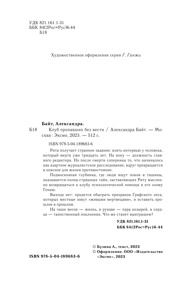 Книга: Клуб пропавших без вести (Александра Байт); Эксмо, Редакция 1, 2023