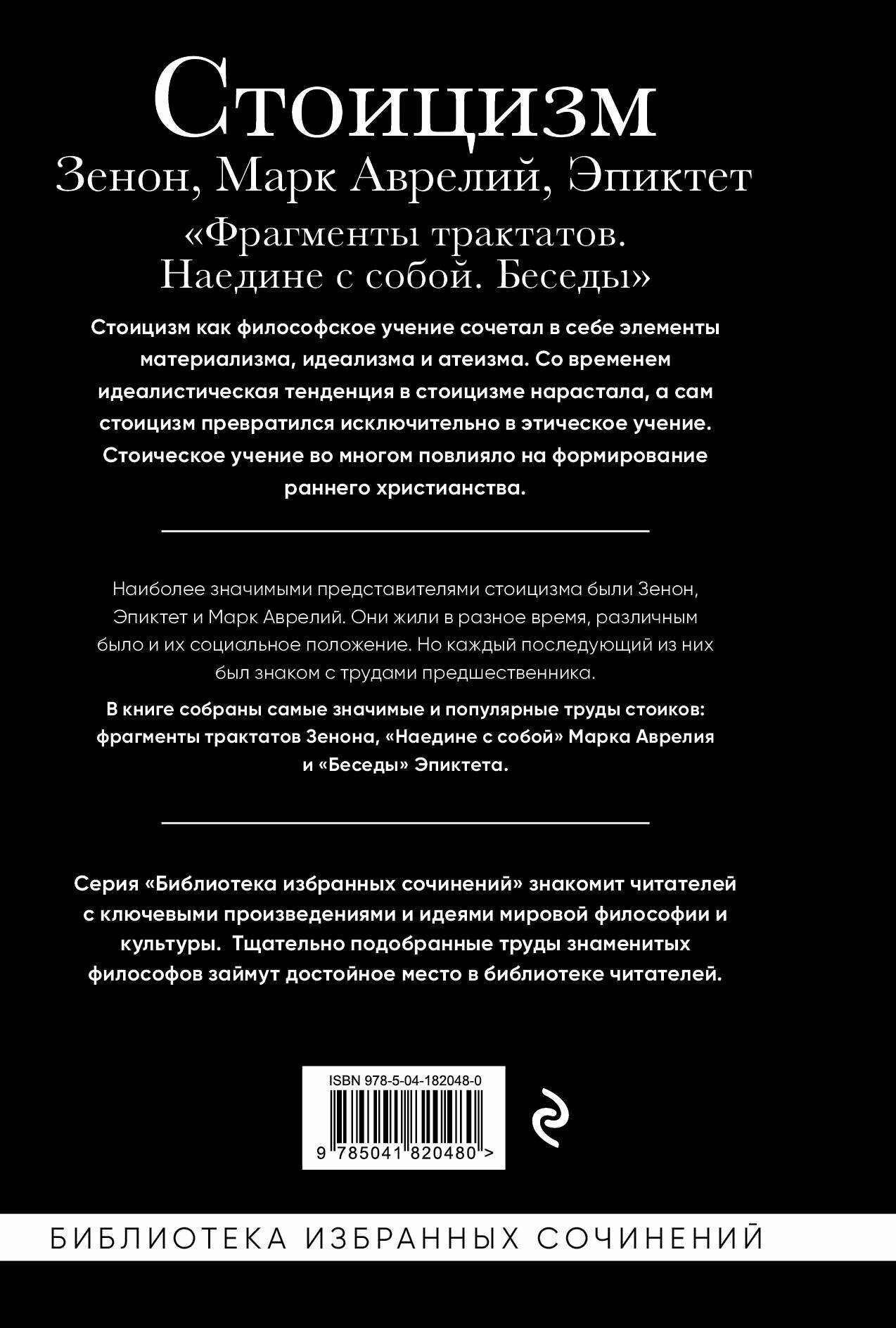 В книге собраны самые значимые и популярные труды стоиков: Фрагменты трактатов Зенона, «Наедине с собой» Марка Аврелия и Беседы Эпиктета.