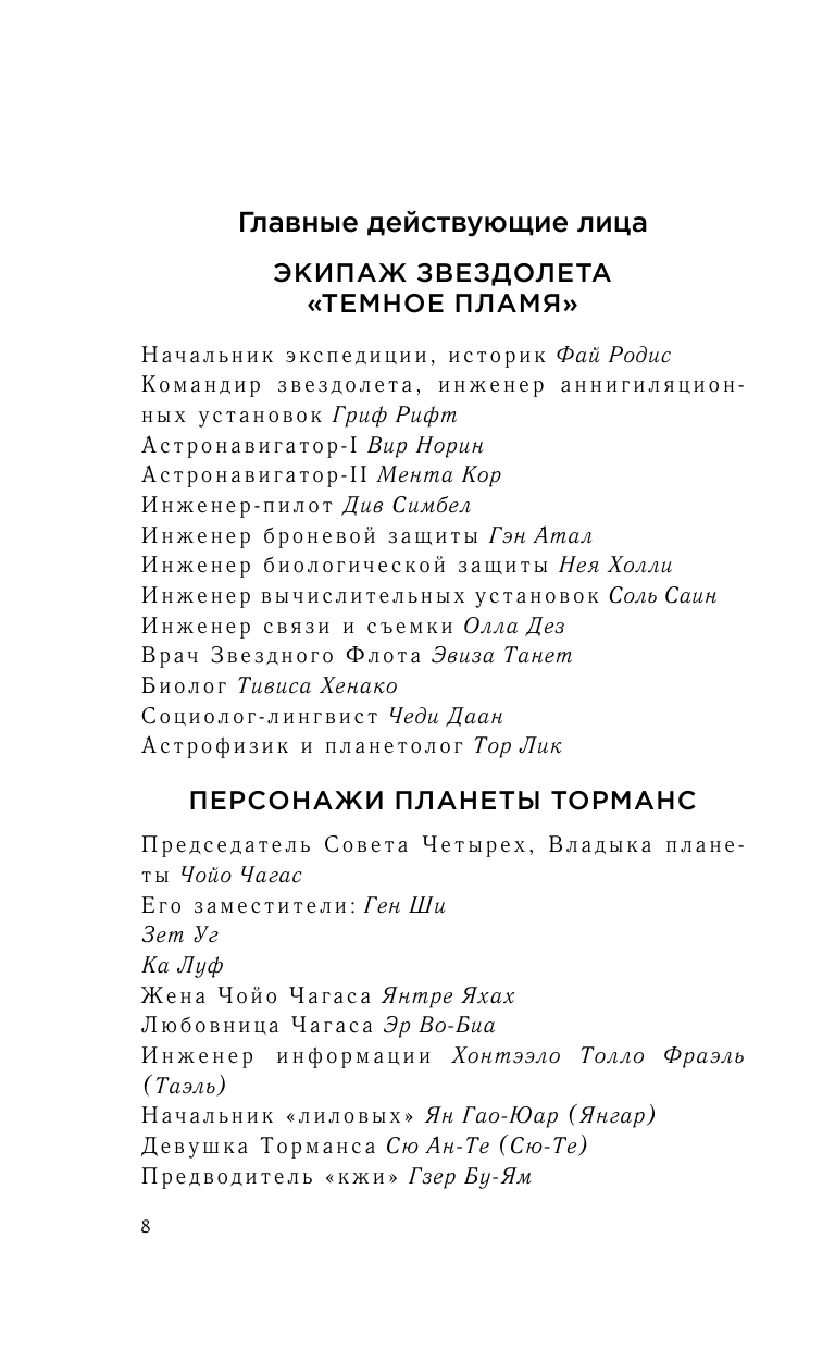 Звездолет «Темное пламя» достиг планеты Торманс, населенной потомками людей, некогда бежавших от наступающего коммунизма с Земли. С первых же дней своего пребывания на Тормансе звездолетчики сталкиваются с жесточайшим тоталитарным режимом, во главе которого стоит Чойо Чагас. Каждое его слово воспринимается его подданными как проявление высочайшей государственной мудрости. Начальнице земной экспедиции, историку Фай Родис, приходится быть максимально осторожной, ведь от нее во многом зависит будущее планеты.