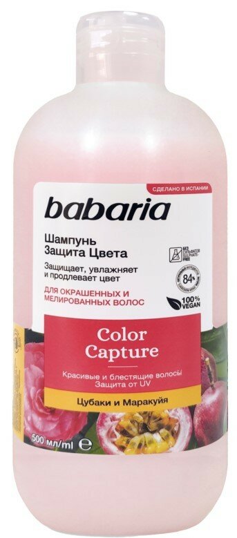 BABARIA безсульфатный шампунь для волос защита цвета 500 мл Безсульфатный шампунь для волос Babaria. Предназначен для окрашенных или мелированных локонов: эффективно очищает, сохраняя стойкость цвета. Формула с UV-фильтром обогащена питательным ингредиентами: экстрактом камелии цубаки и маракуйи. Действующие компоненты безсульфатного шампуня укрепляют локоны, питают полезными веществами, защищают от агрессивного воздействия внешней среды, служат профилактикой перхоти и секущихся кончиков.Не содержит сульфатов. После применения волосы шелковистые, блестящие. Шампунь рекомендуется использовать вместе с бальзамом кондиционером и маской Защита цвета от Babaria.