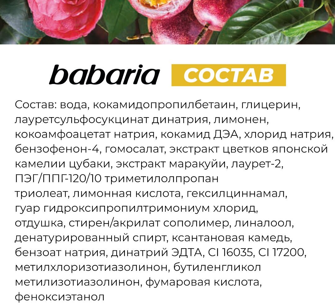 | Состав | Water, Cocamidopropyl Betaine, Disodium Laureth Sulfosuccinate, Sodium Cocoamphoacetate, Glycerin, Cocamide DEA, Sodium Chloride, Benzophenone-4, Homosalate, Camellia Japonica Flower Extract, Passiflora Incarnata Extract, Laureth-2, PEG/PPG-120/10 Trimethylolpropane Trioleate, Guar Hydroxypropyltrimonium Chloride, Parfum, Styrene/Acrylates Copolymer, Alcohol Denat, Xanthan Gum, Sodium Benzoate, Citric Acid, Disodium EDTA, Methylchloroisothiazolinone, Methylisothiazolinone, CI 16035 (FD&C Red No 40), CI 17200 (D&C Red N?33), Hexyl Cinnamal, Linalool, Limonene, Fumaric Acid, Phenoxyethanol, Butylene Glycol |