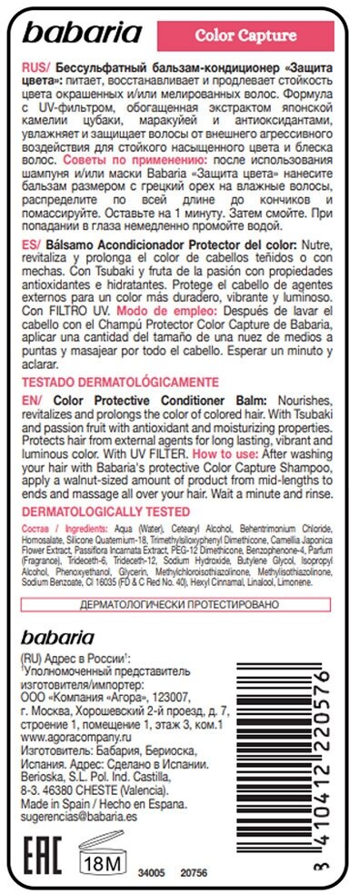 BABARIA бессульфатный бальзам кондиционер для волос защита цвета 200 мл Бессульфатный бальзам кондиционер для волос Babaria. Средство продлевает стойкость цвета, предназначено для окрашенных и мелированных волос. В состав входят ухаживающие ингредиенты, UV-фильтр. Экстракты японской камелии цубаки и маракуйи укрепляют волосы, восполняют влагу, защищают от агрессивного воздействия окружающей среды, питают полезными веществами. Бальзам для волос увлажняет, придает гладкость, здоровый внешний вид и естественный блеск. Бальзам кондиционер рекомендуется использовать вместе с шампунем и маской Защита цвета от Babaria. На 95% состоит из натуральных компонентов.