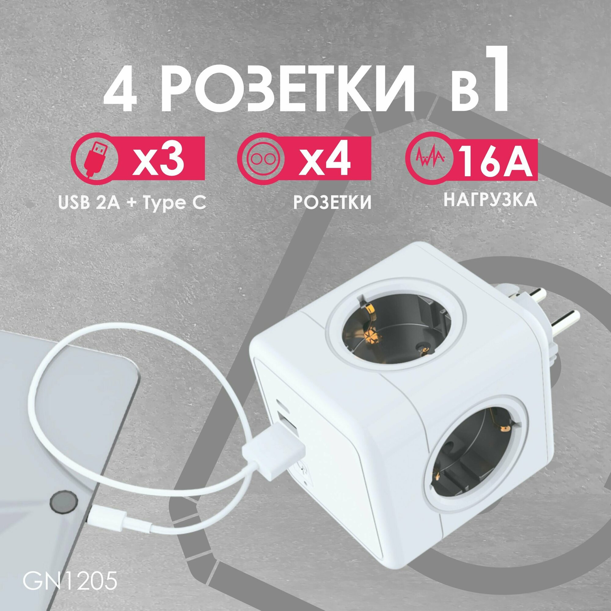 Разветвитель RocketSocket 230 В 16 А IP20 4 розетки 3 USB 2A+C с блоком 5В/3.0А защитные шторки цвет серый GN1205