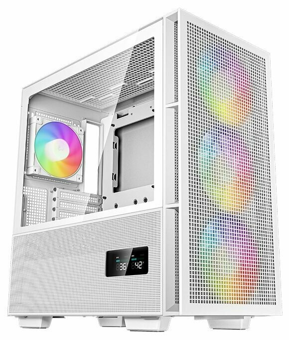 Корпус DEEPCOOL белого цвета выполнен в форм-факторе Mid-Tower. Внутри установлены три ARGB-вентилятора диаметром 140 мм, которые поддерживают PWM. Они быстро включаются и выключаются, что позволяет им работать на низких скоростях. Монтаж платы в корпус осуществляется вертикально. Допускается установка микросхемы формата E-ATX, Standard-ATX, Mini-ITX, Micro-ATX. Для управления подсветкой, включения на верхней панели расположены кнопки. Там же находятся разъемы USB 3.2 Gen1 Type-C и USB 3.2 Gen1 Type-A, аудиоразъем. DEEPCOOL выполнен из пластика, стали. Все стороны корпуса имеют перфорацию, что обеспечивает хороший приток воздуха. Через окошко из закаленного стекла на боковой панели можно увидеть внутренние компоненты. Для удобства сборки и обслуживания панели фиксируются надежными магнитами, а для поддержки видеокарты используется специальный кронштейн. За материнской платой имеется пространство для удобства прокладки и подключения кабелей.