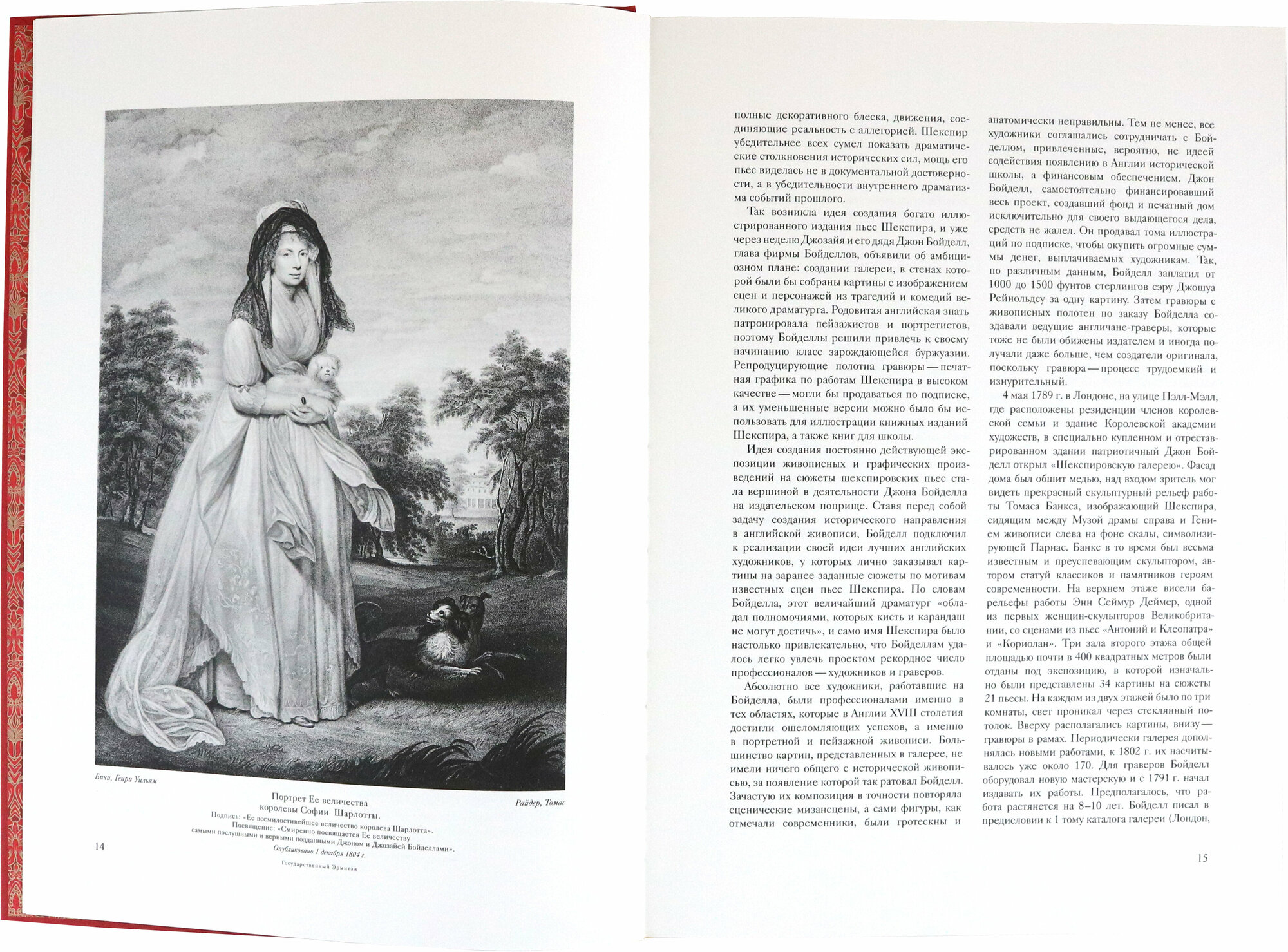 Основой этого издания являются собрание гравюр к 9-томному изданию драматических произведений Уильяма Шекспира и отдельный 2-томный увраж – роскошное, богато иллюстрированное художественное издание большого формата – с «шекспировскими» гравюрами, опубликованные в 1803 г. в Лондоне. Более 100 репродукций воспроизводят гравюры, выполненные по картинам самых выдающихся мастеров живописи и барельефа того времени для издательства Бойделлов («John & Josiah Boydell») и знаменитой «Шекспировской галереи» («Boydell’s Shakespeare Gallery») и отличающиеся уникальной непревзойденной техникой «золотого века» английской графической школы. Источниками для высококачественного собрания иллюстраций стали гравюры, предоставленные Государственным Эрмитажем, Государственным музеем изобразительных искусств имени А. С. Пушкина, Научной библиотекой Томского государственного университета. Это превосходное издание проверенных временем британских классических гравюр-иллюстраций, несомненно, привлечет широчайший круг любителей и почитателей изобразительного и гравировального искусства и мировой литературы.