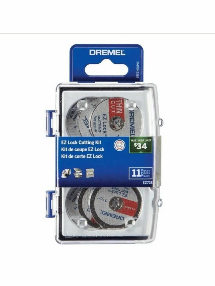 Комплект насадок Dremel . Ассортимент включает в себя 10 отрезных кругов SpeedClic и специальный держатель SpeedClic. Помимо 6 обычных металлических отрезных кругов диаметром 38 мм в набор также входят 2 специальных тонких отрезных круга и 2 уникальных круга для резки пластика.