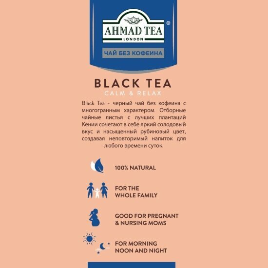 Ароматные декофеинизированные бленды Ahmad Tea созданы с особой любовью и заботой и станут прекрасной альтернативой традиционному напитку. А их изысканный вкус порадует как взрослых, так и детей. Black Tea - черный чай без кофеина с многогранным характером. Отборные чайные листья с лучших плантаций Кении сочетают в себе яркий солодовый вкус и насыщенный рубиновый цвет, создавая неповторимый напиток для любого времени суток.