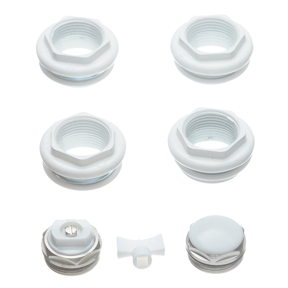 Комплектация: 4 переходника 3/4, для левого или правого подключения с силиконовыми прокладками, 1 воздухоотводчик (клапан маевского), заглушка.