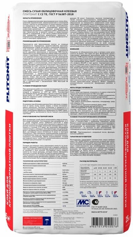 Применяется для укладки керамической плитки, плитки из натурального и искусственного камня на сложные основания внутри и снаружи помещений. Возможно проводить работы по всем видам недеформирующихся оснований, а также по старой краске, плитка на плитку . Открытое время составляет 30 минут, время корректировки - 30 минут, прочность сцепления с основанием керамогранита не менее 1.0 МПа. Класс С2ТЕ по международной классификации ЕN 12004.
