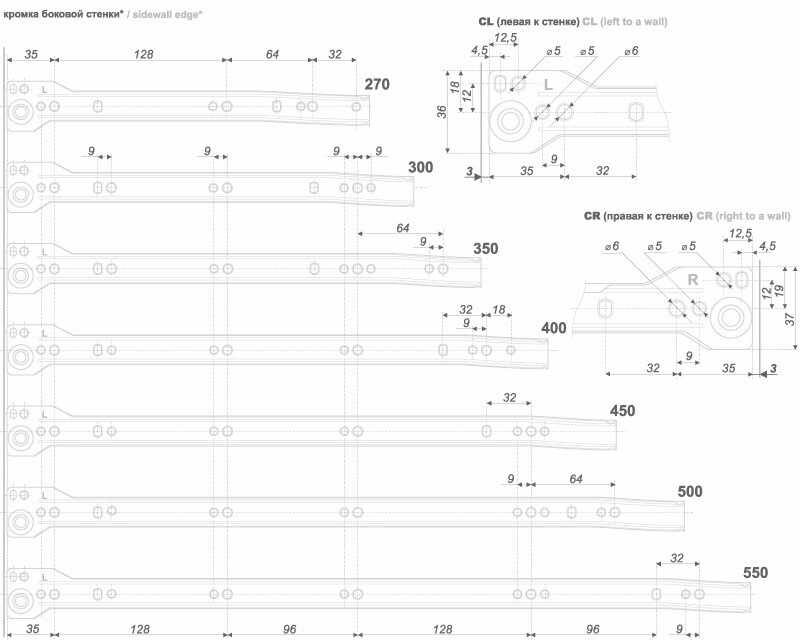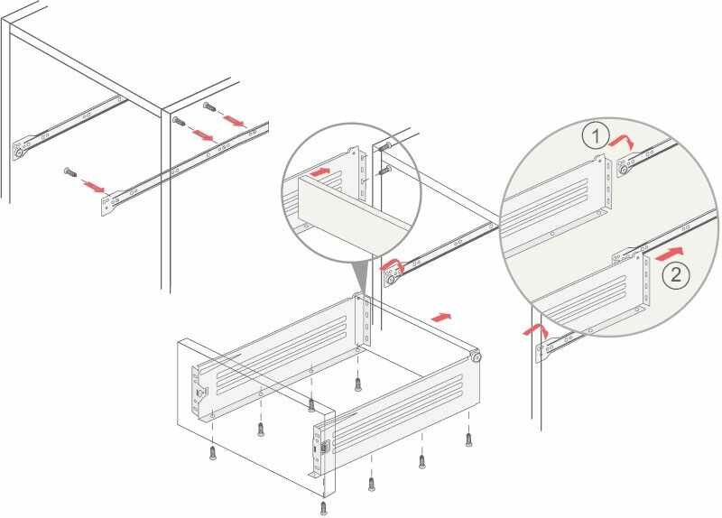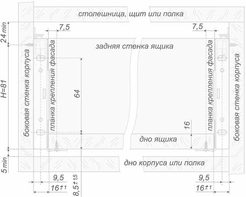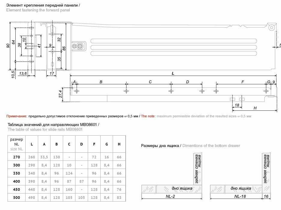 Применяется для изготовления выдвижных ящиков, с регулировкой фасада по высоте (+/- 2мм). Высота боковой стенки 86 мм
