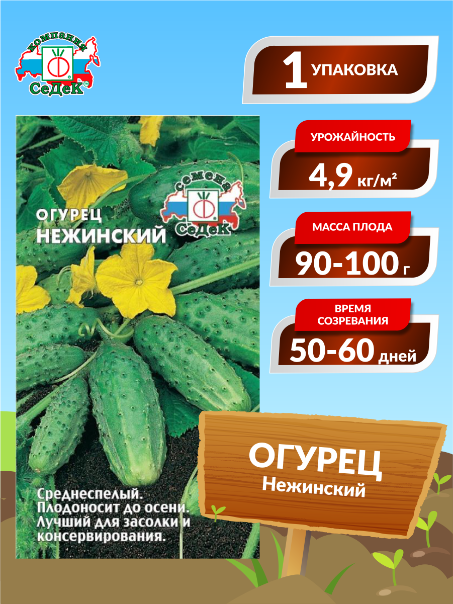 Огурец СеДеК Нежинский - высокоурожайный среднеспелый сорт с периодом созревания 55 дней. Выращивается в теплицах, пленочных укрытиях и на открытых участках грунта. Растение сильнорослое, имеет длинноплетистые стебли.