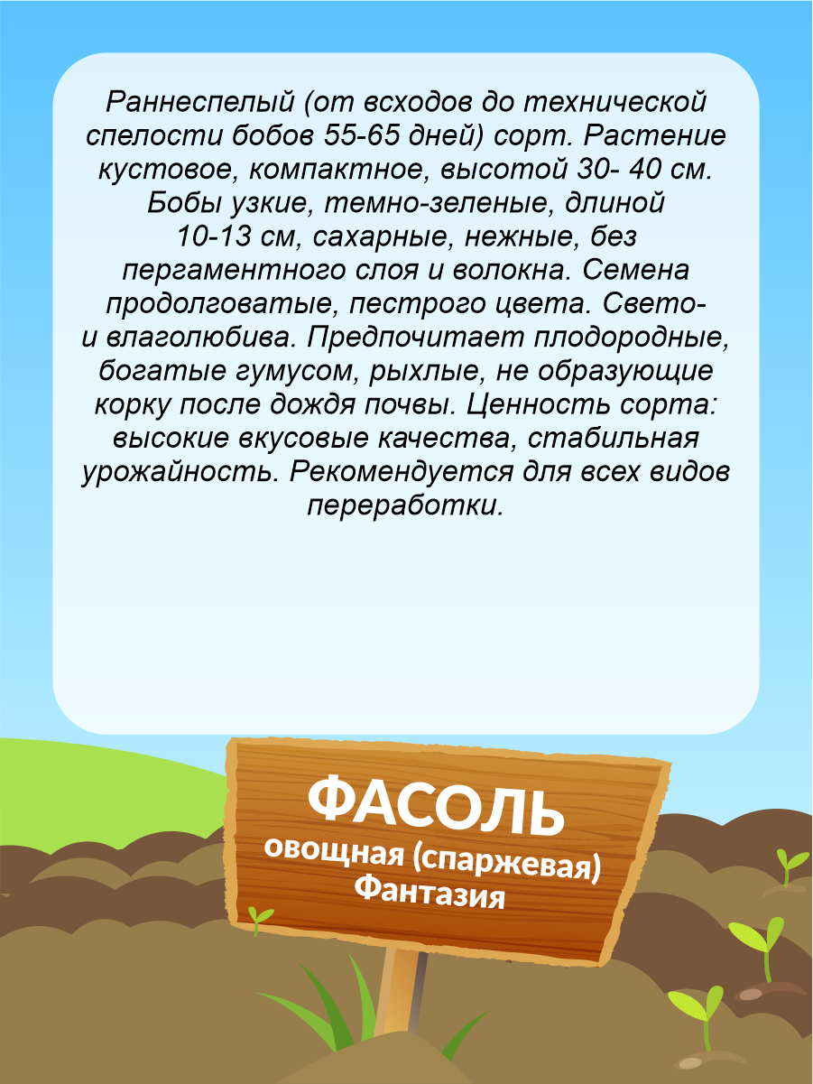 Раннеспелый (от всходов до технической спелости бобов 55-65 дней) сорт. Растение кустовое, компактное, высотой 30- 40 см. Бобы узкие, темно-зеленые, длиной 10-13 см, сахарные, нежные, без пергаментного слоя и волокна. Семена продолговатые, пестрого цвета. Свето- и влаголюбива. Предпочитает плодородные, богатые гумусом, рыхлые, не образующие корку после дождя почвы. Ценность сорта: высокие вкусовые качества, стабильная урожайность. Рекомендуется для всех видов переработки.