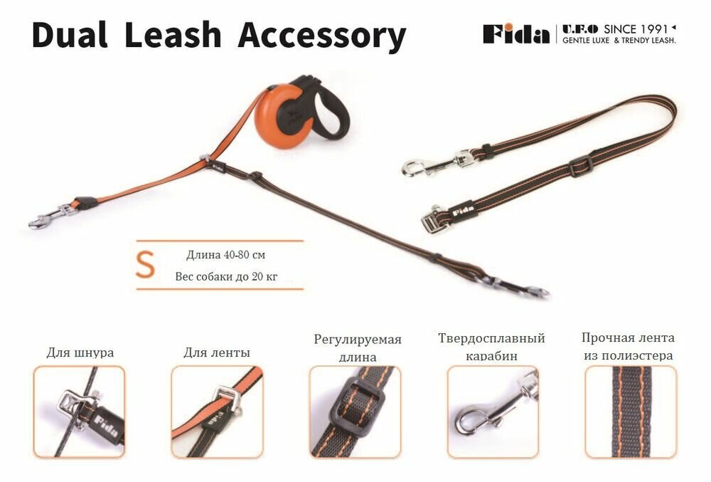 Ремень-насадка Fida Dual leash с декоративными вставками для второй собаки, который отлично подходит для рулетки со шнуром и позволит управлять сразу двумя собаками среднего веса (общий вес двух собак до 20 кг). Данный аксессуар не ограничивает движений собаки, а простота установки на основной поводок позволит справиться даже ребёнку. Цвет: оранжевый, белый.