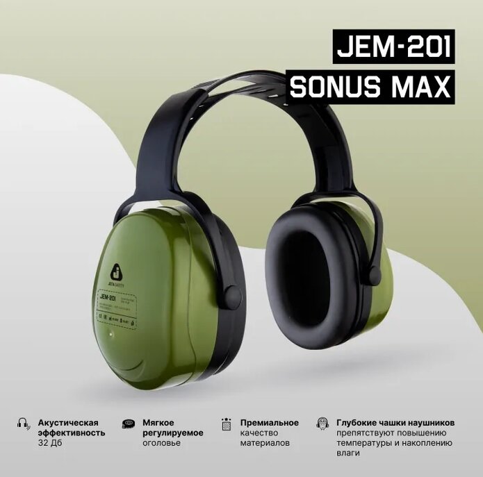 JEM201 Sonus Max — защитные наушники с регулируемым оголовьем. Акустическая эффективность 32 дБ. Наушники необходимы для защиты слуха от регулярного воздействия шумов со звуковым давлением 85–110 дБ. Применяются в промышленных работах, строительных, монтажных, слесарно-столярных и других работах, сопровождающихся громким шумом.