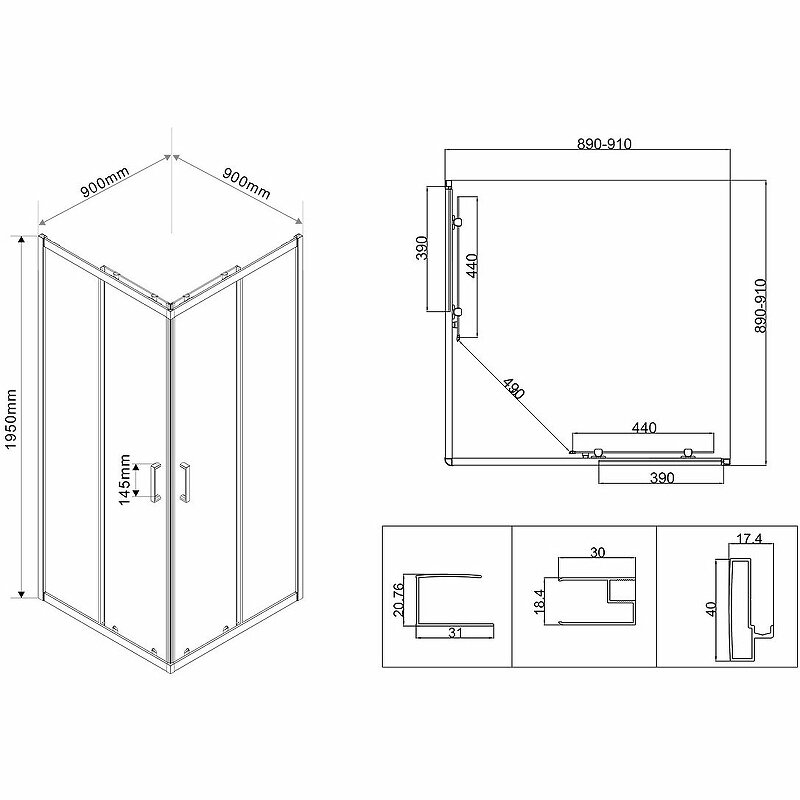 В комплекте поставки: душевой уголок, двойные верхние и одинарные нижние ролики, ручка из АБС-пластика.