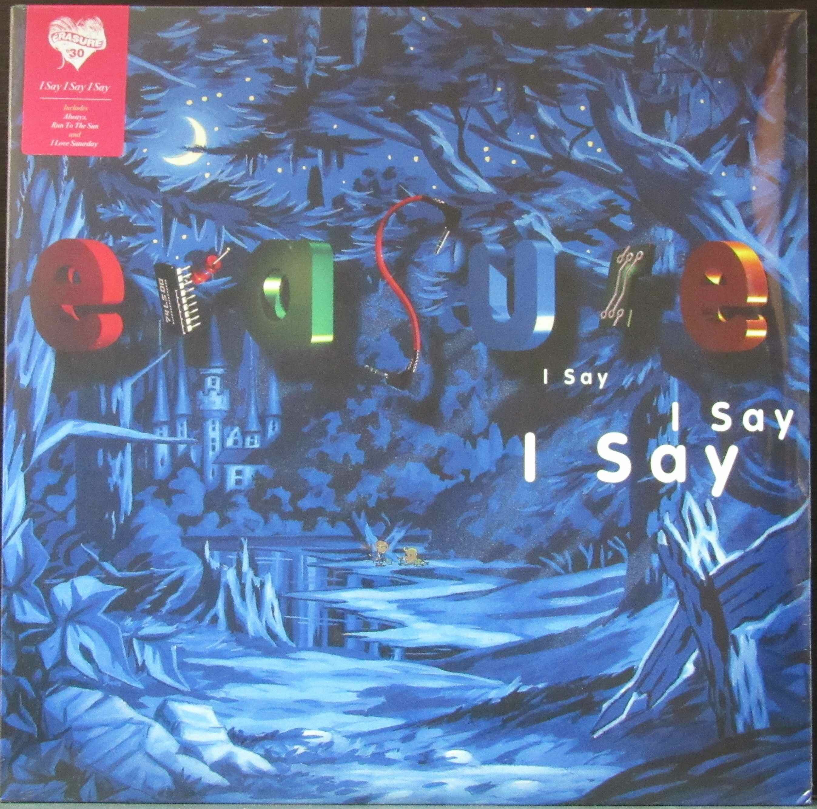 Erasure: I Say I Say I Say. 1 LP. A1 Take Me Back, A2 I Love Saturday, A3 Man In The Moon, A4 So The Story Goes, A5 Run To The Sun, B1 Always, B2 All Through The Years, B3 Blues Away, B4 Miracle, B5 Because You're So Sweet, Producer - Martyn Ware, Written-By - Clarke Bell, Made in the E.U.