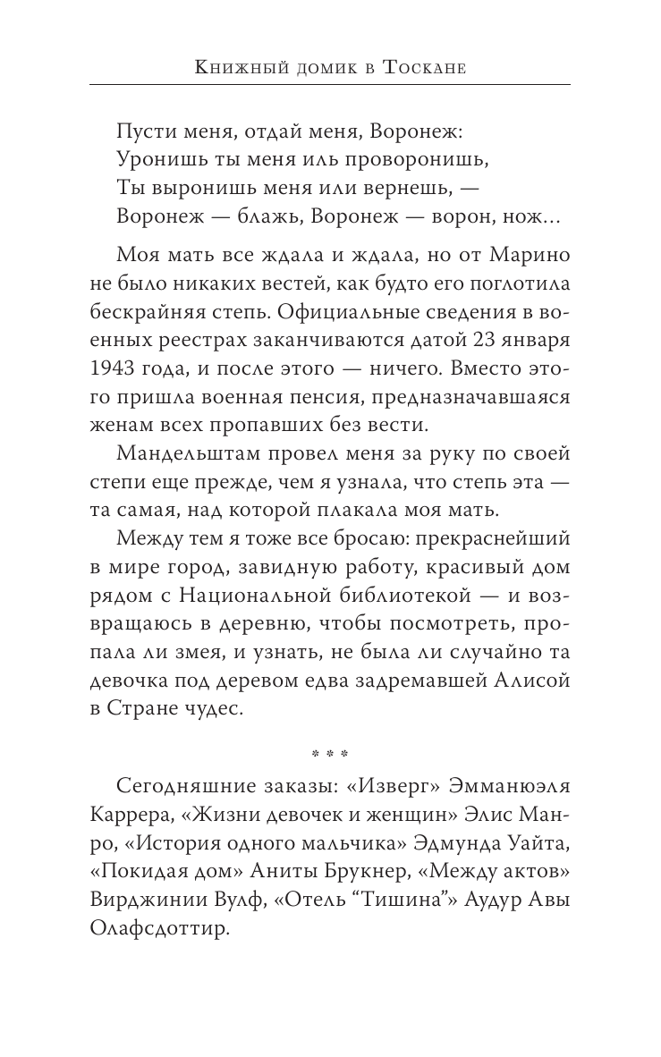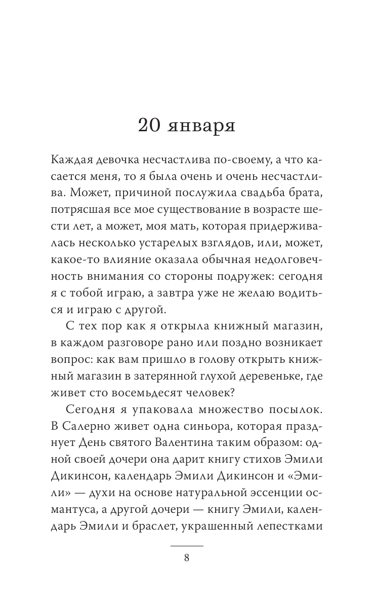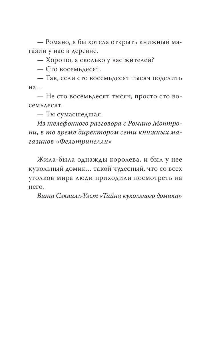 Волшебная книга о дивном месте, которое существует на самом деле. Магазинчик с книгами в крошечной деревушке, затерянной среди холмов Тосканы – маленький, но полный чудес, будто сундучок с сокровищами. В жизни этого магазинчика есть все – от бегущих в него со всех ног детей до необыкновенных литературных джемов, от Эмили Дикинсон до современной итальянской писательницы Пии Перы. Дни его наполнены теплом, жизнью, удивительными историями и словами, которые, соединяясь в строчки, становятся той чарующей нитью, что привязывает нас навсегда: комната, полная книг, становится порогом, ведущим нас в бескрайний удивительный мир.