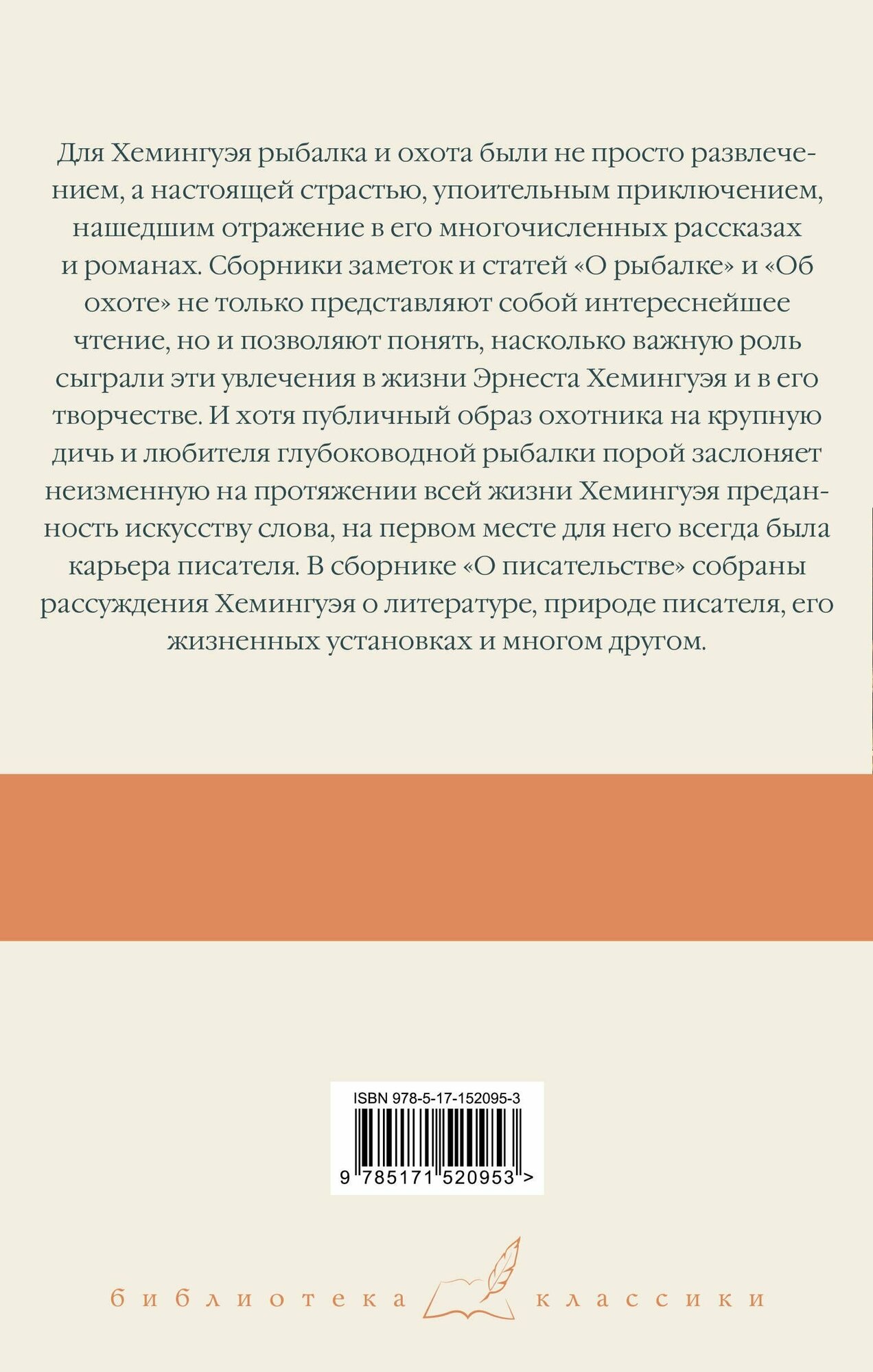 Для Хемингуэя рыбалка и охота были не просто развлечением, а настоящей страстью, упоительным приключением, нашедшим отражение в его многочисленных рассказах и романах. Сборники заметок и статей "О рыбалке" и "Об охоте" не только представляют собой интереснейшее чтение, но и позволяют понять, насколько важную роль сыграли эти увлечения в жизни Эрнеста Хемингуэя и в его творчестве. И хотя публичный образ охотника на крупную дичь и любителя глубоководной рыбалки порой заслоняет неизменную на протяжении всей жизни Хемингуэя преданность искусству слова, на первом месте для него всегда была карьера писателя. В сборнике "О писательстве" собраны рассуждения Хемингуэя о литературе, природе писателя, его жизненных установках и многом другом.