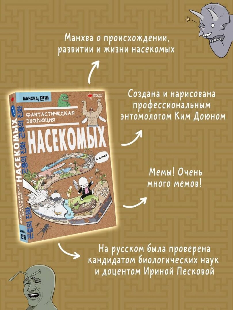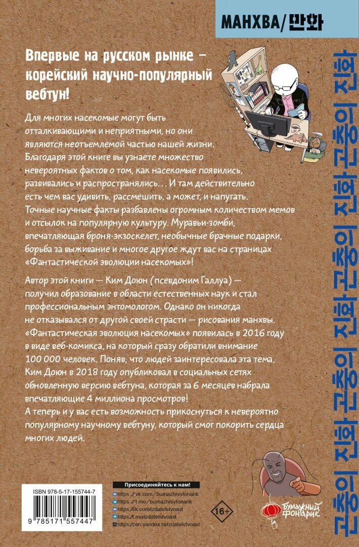 "Фантастическая эволюция насекомых" — это научно-популярный корейский вебтун, который благодаря бешеной популярности в интернете (более 4 миллионов просмотров) позже был издан в печатном формате. Благодаря этой книге вы сможете узнать все о происхождении, развитии и жизни насекомых. Узнаете