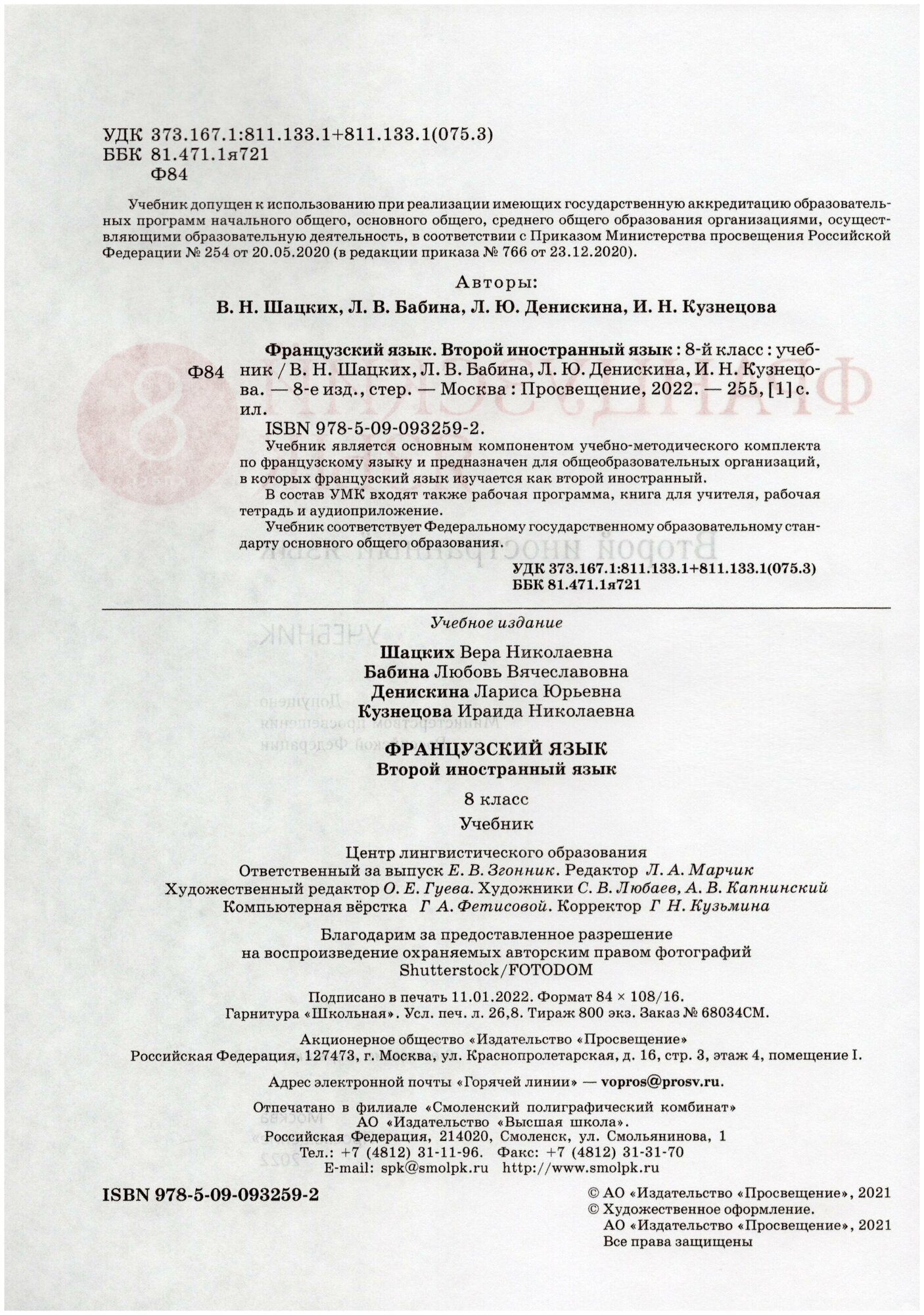 Французский язык. 8 класс. Второй иностранный язык. Учебник (Шацких Вера Николаевна, Бабина Любовь Вячеславовна, Денискина Лариса Юрьевна); Просвещение, 2022