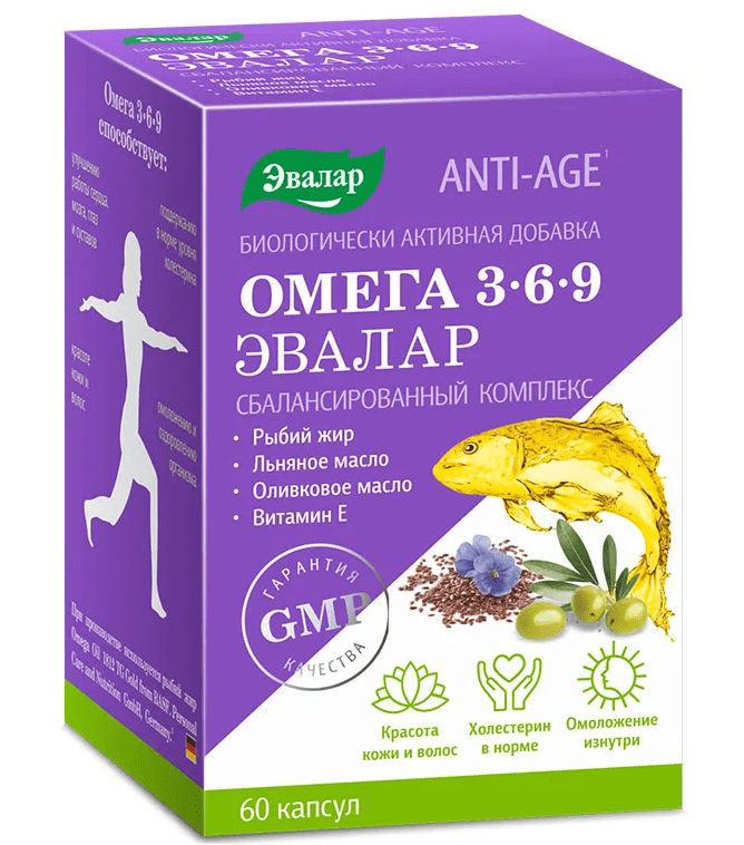Омега 3-6-9 от компании Эвалар - это cбалансированный комплекс трех жирных кислот - омега-3, омега-6, омега-9, а также витамина Е. Действуя вместе, компоненты комплекса способствуют:- улучшению работы сердца, мозга, глаз и суставов;- поддержанию в норме уровня холестерина;- красоте кожи и волос;- омоложению и оздоровлению организма. Каждая капсула комплекса Омега 3-6-9 от Эвалар содержит:- Рыбий жир (омега-3)- Оливковое масло (омега-3, омега-6)- Льняное масло (омега-3, омега-6, омега-9)- Витамин Е. Рыбий жир является источником полиненасыщенных жирных кислот класса омега-3, в частности - "эйкозапентаеновой" (ЭПК/EPA) и "докозагексаеновой"(ДГК/DHA).ЭПК и ДГК являются незаменимыми кислотами (т.е. сами не вырабатываются в организме), поэтому их поступление извне с пищей или добавками является обязательным. Состав: в 1 капсуле содержится: льняное масло – 900 мг; рыбий жир – 220 мг; оливковое масло – 160 мг;витамин Е (а-токоферола ацетат) – 10 мг; смесь токоферолов (антиокислитель), компоненты капсулы (пищевые добавки): желатин, глицерин (агент влагоудерживающий).Рекомендации по применению: взрослым – по 1 капсуле 2 раза в день во время еды. Продолжительность приема – 1 месяц. После перерыва в 1 месяц возможен повторный прием.