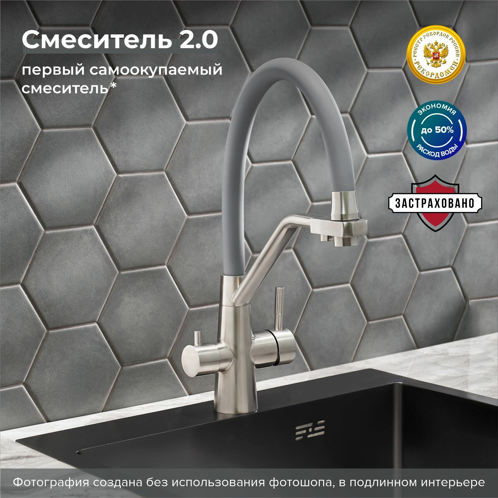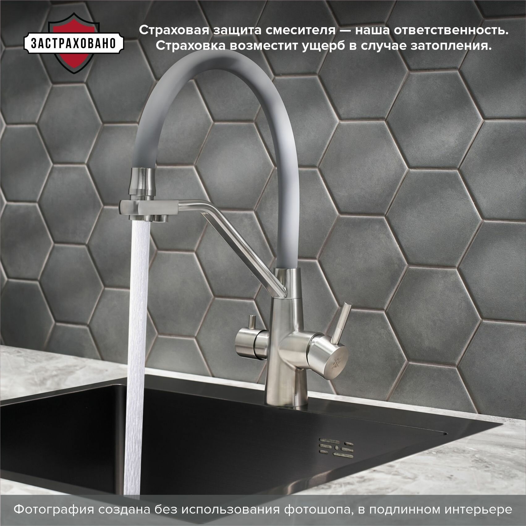 - Излив: поворотный, гибкий, с каналом для питьевой воды.