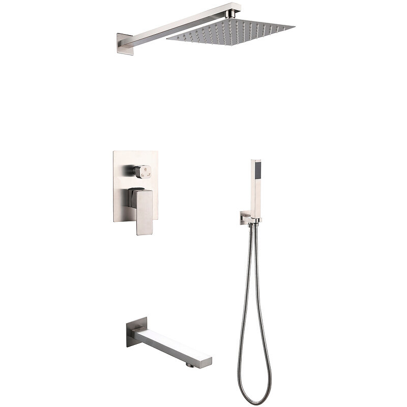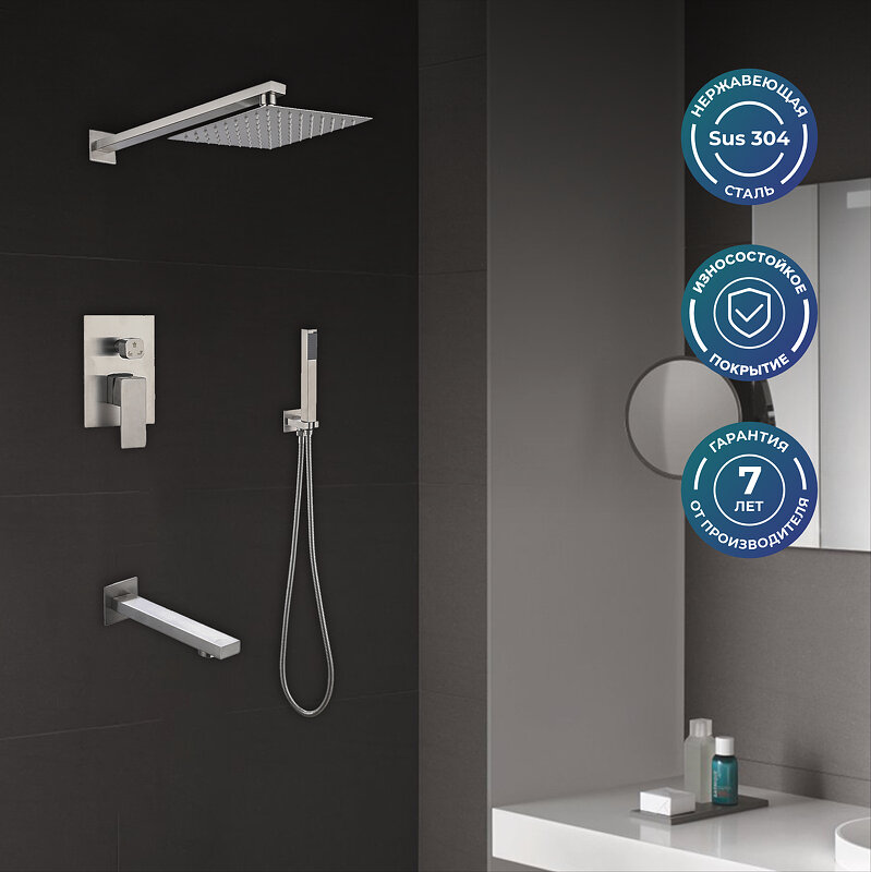 Душевой комплект, с встраиваемым смесителем с изливом, душевой и ручной лейкой, для ванны и душа выполнен из нержавеющей стали и прекрасно впишется в интерьер вашей ванной комнаты, лишние элементы скрыты в стене. Смеситель для ванны дополняет встроенная душевая стойка с тропическим душем. Душевая система идеально подходит для установки в душевой уголок или же в ванную комнату. Использовать смесители и душевое оборудование из нержавеющей стали можно в течение длительного времени. При простом уходе смеситель для ванны с душем не потеряет первоначальный вид. Смеситель для ванны и душа из нержавеющей стали, выполненный в соответствии с современными дизайнерскими тенденциями, органично впишется в интерьер ванной комнаты. Покупка водосберегающего смесителя 2.0 РМС - выгодное и практичное решение. С ним вы уменьшите плату за воду. Наш смеситель полностью окупает свою стоимость. Со смесителем 2.0 РМС вы снизите расход воды до 50%. Модель из новой линейки смесителей 2.0 РМС снабжена водосберегающим регулятором. Регулятор позволяет снизить давление воды на выходе из лейки и стабилизировать его. Если давление воды в водопроводе слишком сильное, то струя в душе получается слишком жесткой и некомфортной, а в процессе мытья расходуется лишняя вода. Регулятор устанавливает минимально комфортное давление в шланге и в лейке. Струя становится мягче, приятнее для тела, при этом визуально она не отличается от обычной ни по объему, ни по диаметру. При этом за счет снижения давления расход воды сокращается. Смесители РМС официально признаны самыми экономичными и занесены в Реестр рекордов России. Новые смесители РМС - российская разработка. Пользоваться смесителем РМС 2.0 удобно и приятно. Сантехника, смесители устойчивы к царапинам и перепадам температур, экологичны и безопасны для вашего здоровья. Мы используем только проверенные надежные комплектующие. Ухаживать за смесителем РМС просто: достаточно протирать его мягкой тканью. Чтобы установить смеситель, специальных навыков не потребуется. В обновленных смесителях РМС заложена концепция бережливого потребления. Выбирая их, вы не только экономите собственные средства, но и помогаете сберечь такой ценный природный ресурс, как питьевая вода. Смесители РМС — это сертифицированный продукт с 7-летней гарантией.
